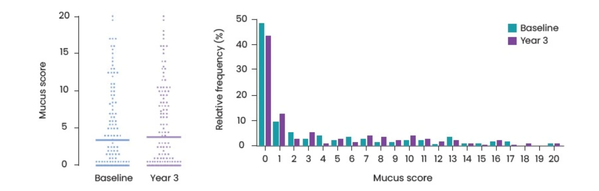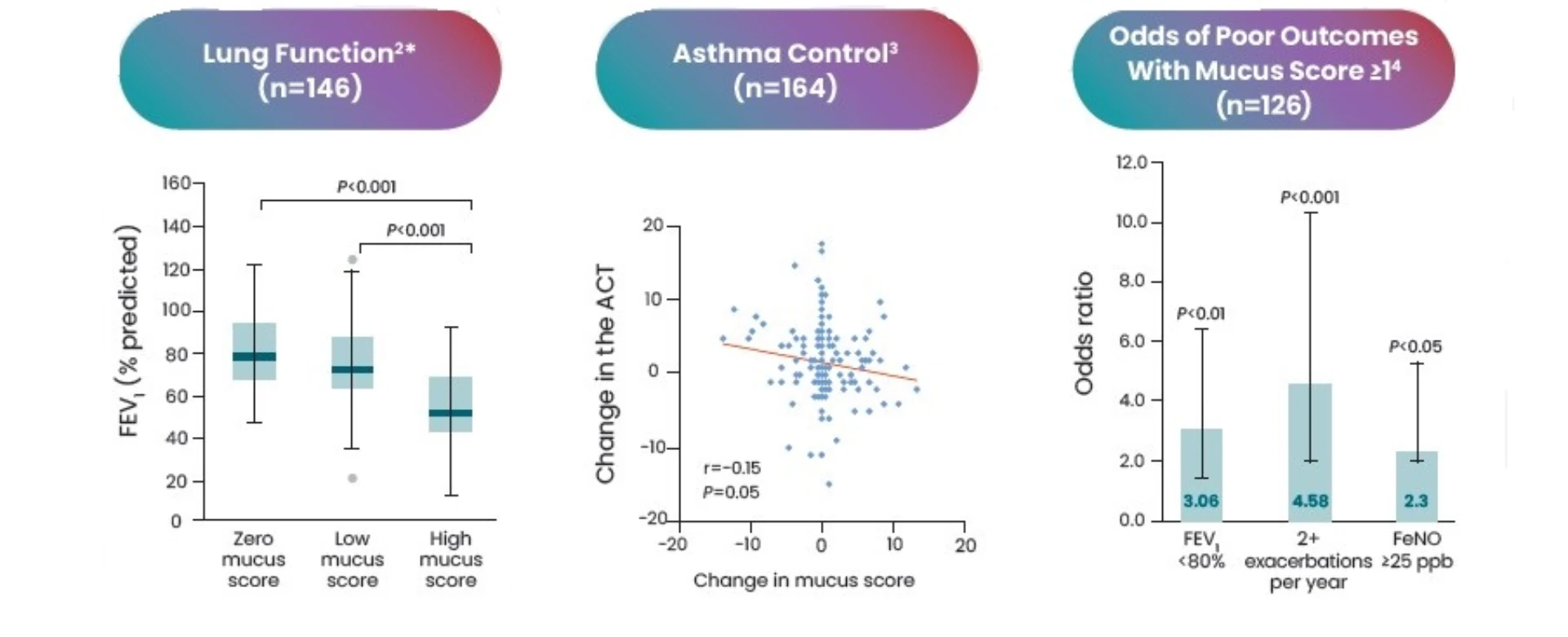 High mucus scores (≥4 bronchial subsegments with 1 or more airways completely occluded with mucus) were associated with low FEV1 and air trapping in patients with chronic, severe asthma2 |