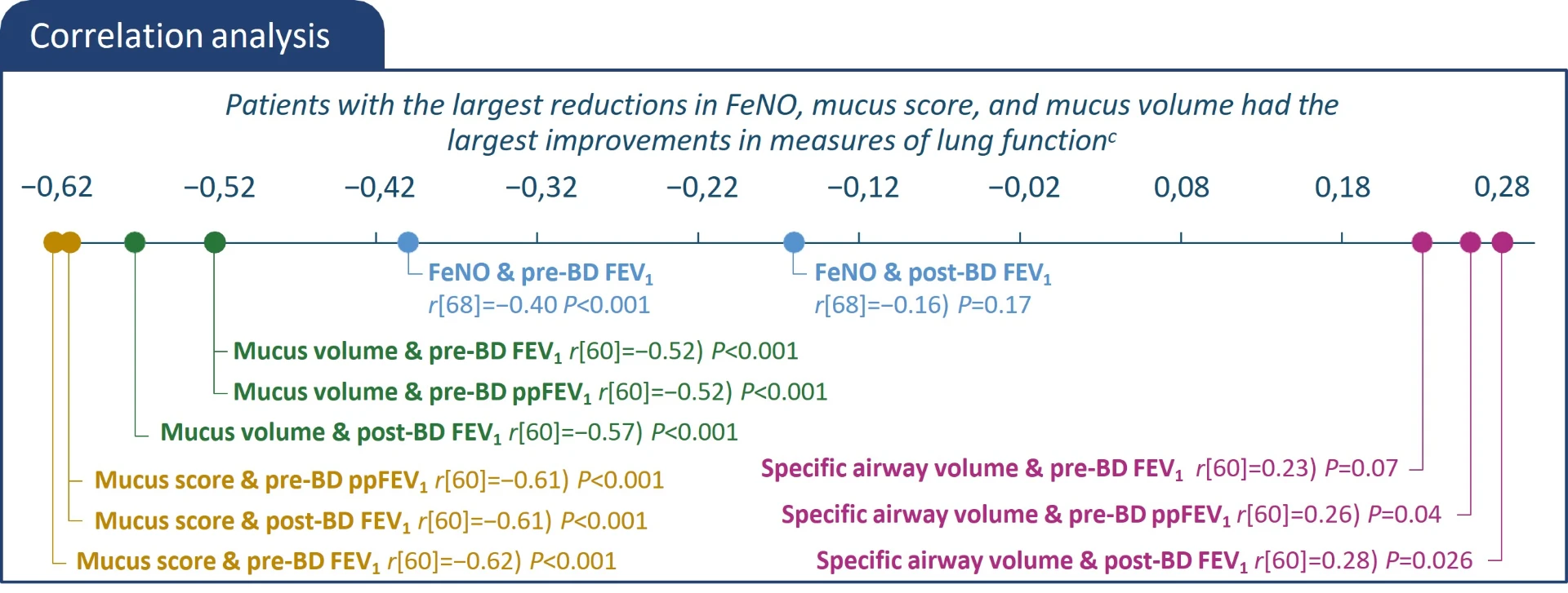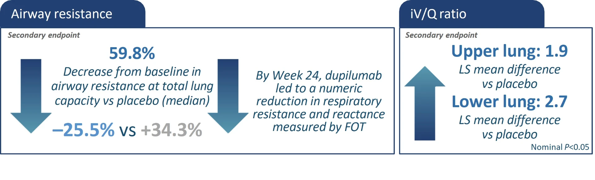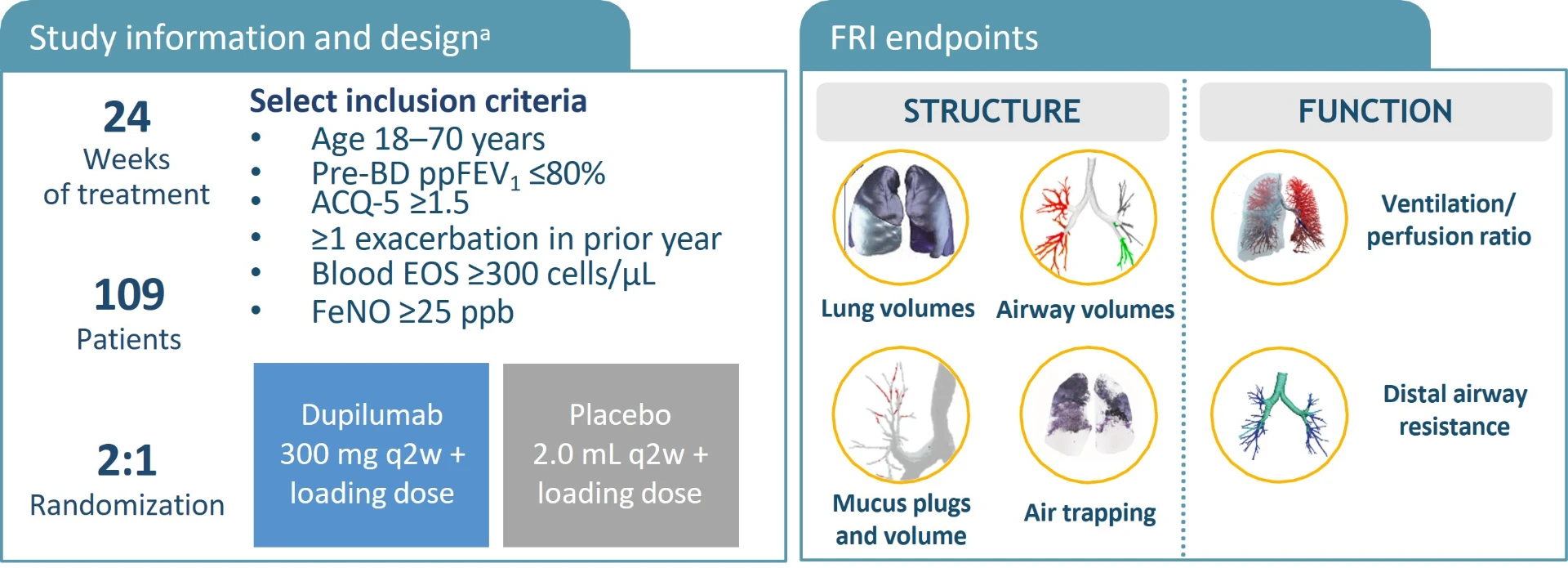 ACQ, asthma control questionnaire; BD, bronchodilator; CT, computed tomography; EOS, eosinophils; FeNO, fractional exhaled nitric oxide; FEV1, forced expiratory volume in 1 second; FOT, forced oscillation technique FRI, functional residual imaging; ICS, inhaled corticosteroids; ITT, intention-to-treat; iV/Q, image-based ventilation-perfusion ratio; LS, least squares; ppFEV1, percent predicted forced expiratory volume in 1 second; q2w, every 2 weeks.