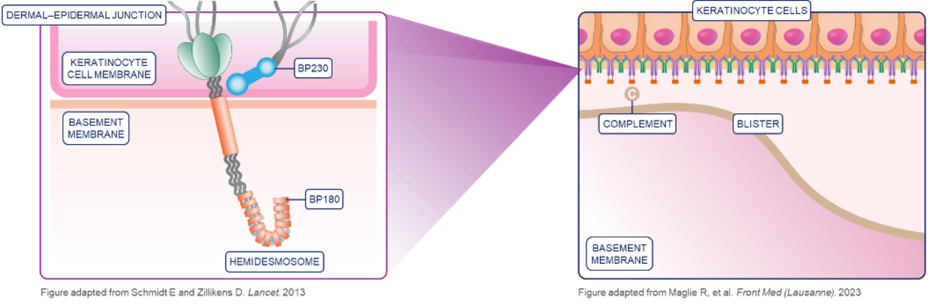 IgG and IgE autoantibodies targeting BP180 and BP230 are produced and bind to the basement membrane zone and initiate a complement cascade. In parallel, keratinocytes begin to release proinflammatory cytokines into the environment in a complement-independent manner.1,3,4,8,9