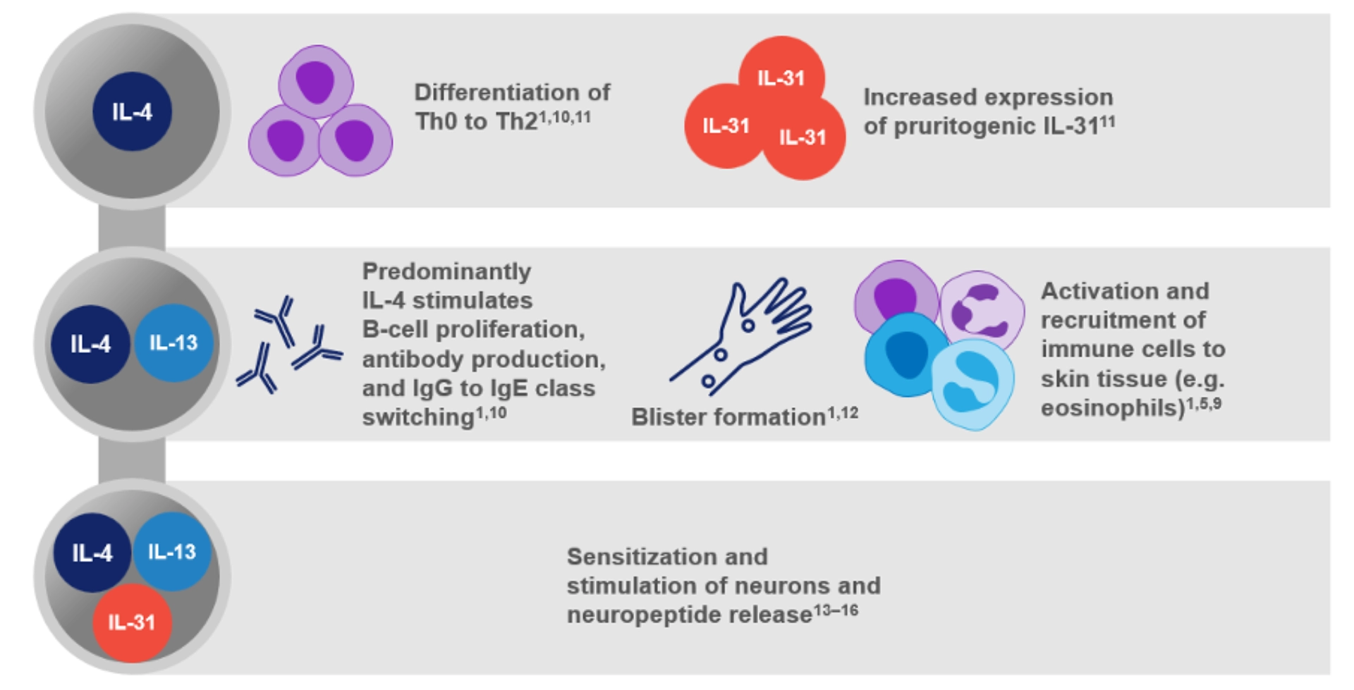 Type 2 inflammatory cytokines, IL-4, IL-13, and IL-31, play multiple roles in the pathophysiology of bullous pemphigoid, including blister formation.1,5,10–18