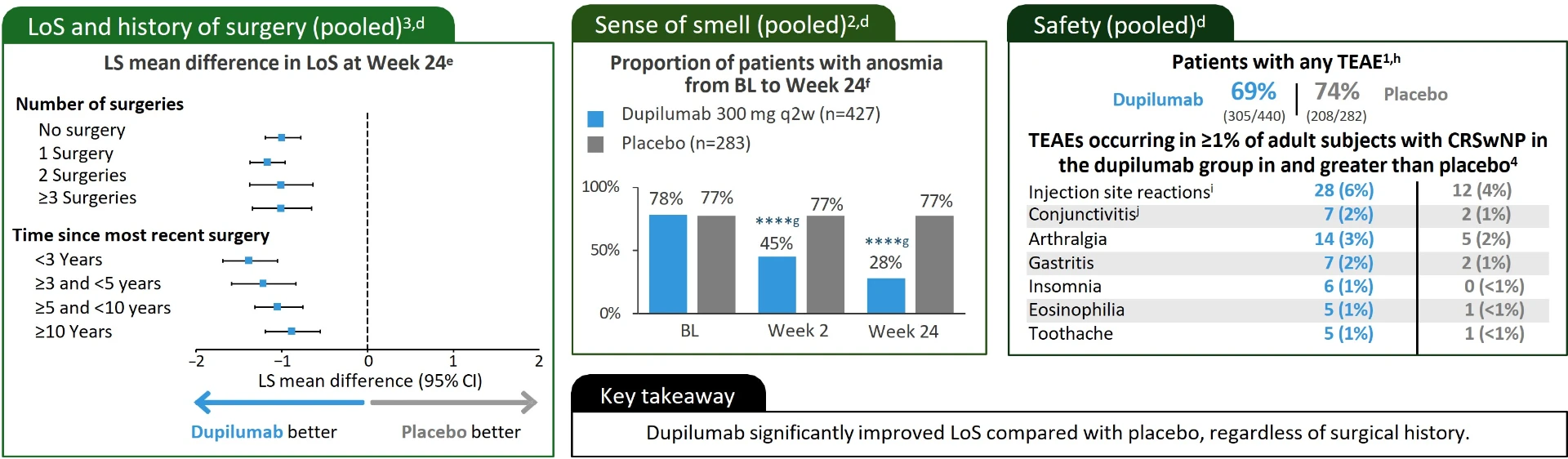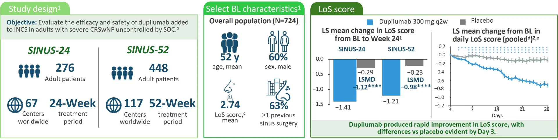 aPlease see manuscripts for full details.1–3 bEligible patients were aged ≥18 years with bilateral nasal polyps and symptoms of CRS despite INCS therapy before randomization and had received SCS in the preceding 2 years (or had a medical contraindication or intolerance to SCS) or previous sinonasal surgery. In SINUS-24, patients were randomly assigned (1:1) to dupilumab 300 mg SC q2w or to matching placebo. In SINUS-52, patients were randomly assigned (1:1:1) to dupilumab 300 mg SC q2w for 52 weeks, the same schedule for the first 24 weeks followed by dupilumab 300 mg SC q4w, or placebo. cScale 0–3: Higher scores indicate greater disease severity. dPooled data from SINUS-24 and SINUS-52. e(n=724). fOnly the 710 patients who completed an UPSIT assessment at BL were included in this analysis. gNominal.hTwo deaths occurred during the study period that were deemed unrelated to the study drug; 1 patient given placebo in SINUS-24 had suspected myocardial infarction occurring after the period of TEAEs, and 1 treated with dupilumab in SINUS-52 had intracranial hemorrhage after a fall, occurring within the period of TEAEs. These patients were not included in the safety population. iInjection site reactions cluster included injection site reaction, pain, bruising and swelling. jConjunctivitis cluster included conjunctivitis, allergic conjunctivitis, bacterial conjunctivitis, viral conjunctivitis, giant papillary conjunctivitis, eye irritation, and eye inflammation.