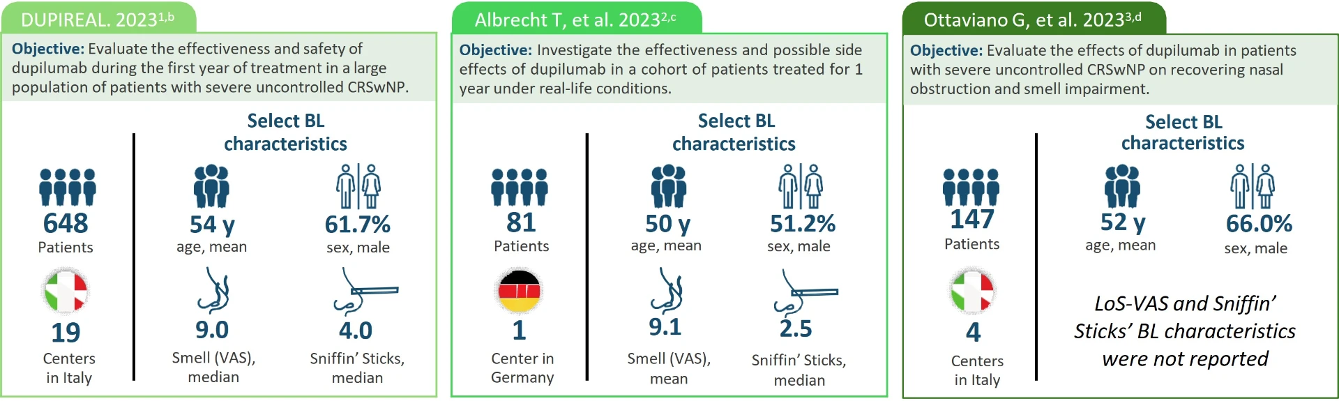 aPlease see manuscripts for full details.1–3 Note that real-world data are collected from diverse sources outside the controlled environment of a clinical trial. As such, the reliability of real-world data can be hindered by data quality issues, confounding variables, and limitations in establishing causality.4 bA phase 4 real-life, observational, retrospective, multicenter study that assessed the effectiveness and safety of dupilumab 300 mg SC q2w in patients with severe uncontrolled CRSwNP over the first year of treatment. Patients enrolled were treated between November 2020 and March 2022. cA real-world prospective observational study that included patients with CRswNP who underwent treatment with dupilumab. Patients were treated with dupilumab 300 mg SC q2w as an add-on therapy to INCS. The treatment period for this study wasnot specified in the manuscript. dAn observational, retrospective multicenter study. Patients were treated with dupilumab 300 mg SC q2w as an add-on therapy to INCS for ≥1 year and followed between February 2020 and November 2022. eData from different studies are not meant to be directly compared. Data reported are not comprehensive. fThe manuscript does not provide data on the statistical significance of the change from baseline to the specified timepoint.