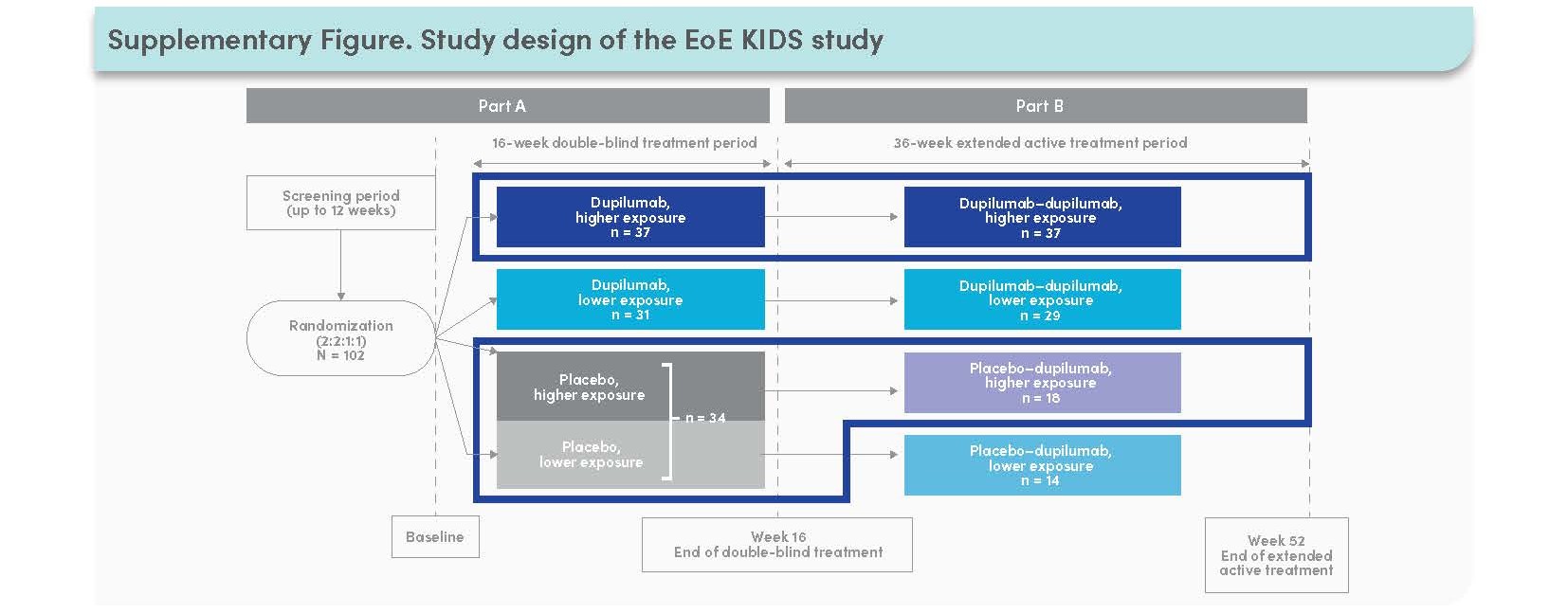 - The EoE KIDS study comprised a double-blind, placebo-controlled period (Part A) where patients were randomized 2:2:1:1 to receive weight-tiered dupilumab higher exposure or lower exposure, or placebo (2 groups) for 16 weeks, and a 36-week extension period where all patients received dupilumab higher exposure or lower exposure (Part B)