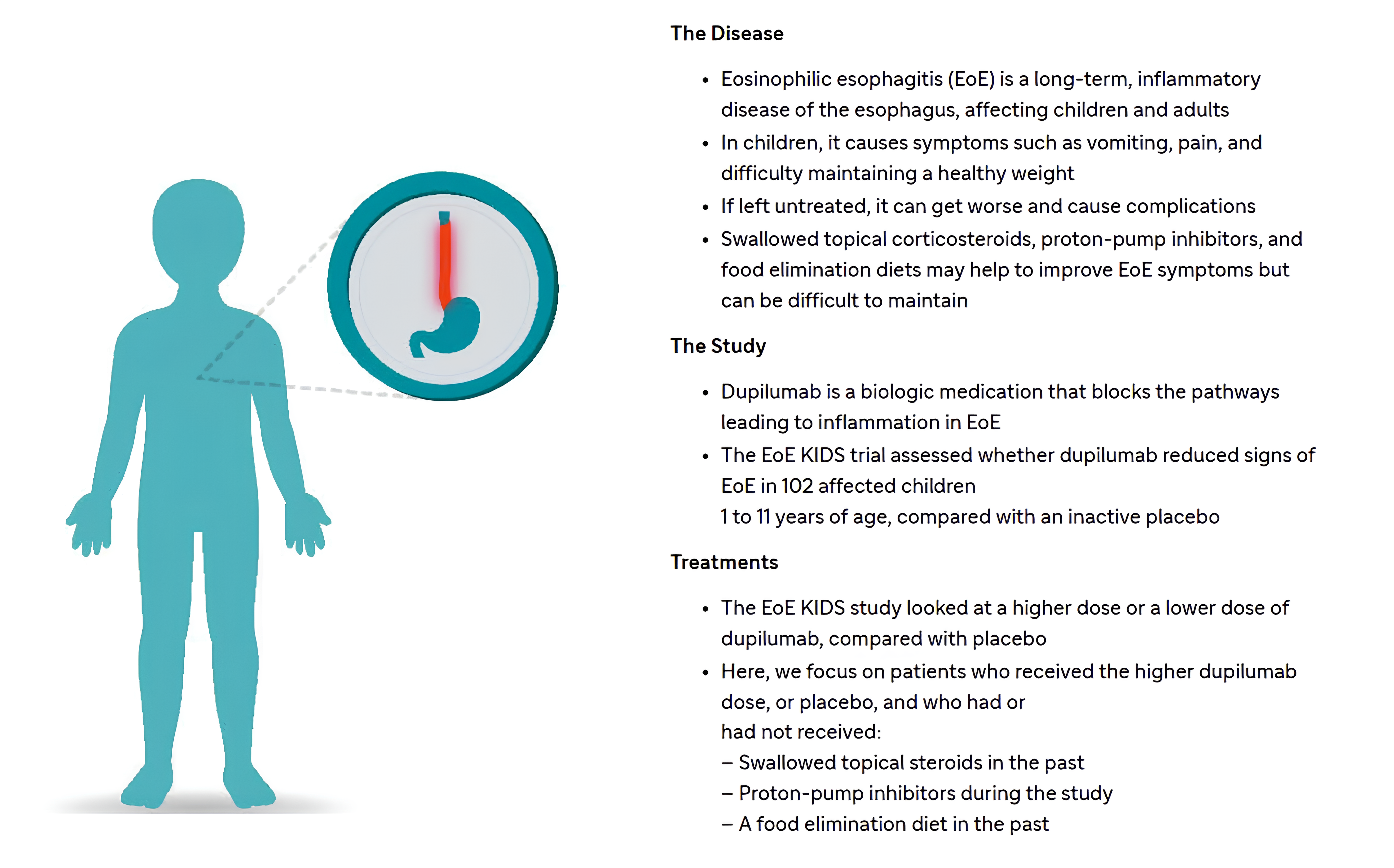 Chehade M, et al. Dupilumab is Effective in Treating EoE in Patients Weighing ≥15 kg: Results from the Phase 3 EoE KIDS Study. Presented at Digestive Diseases Week (DDW) 2025: San Diego, CA, USA; May 3–6, 2025.