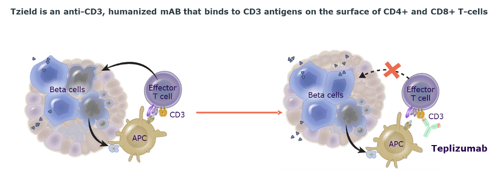 Tzield is the first and only disease modifying immunotherapy developed for aT1D that treats the underlying cause of the disease by preserving beta-cell function.1-3