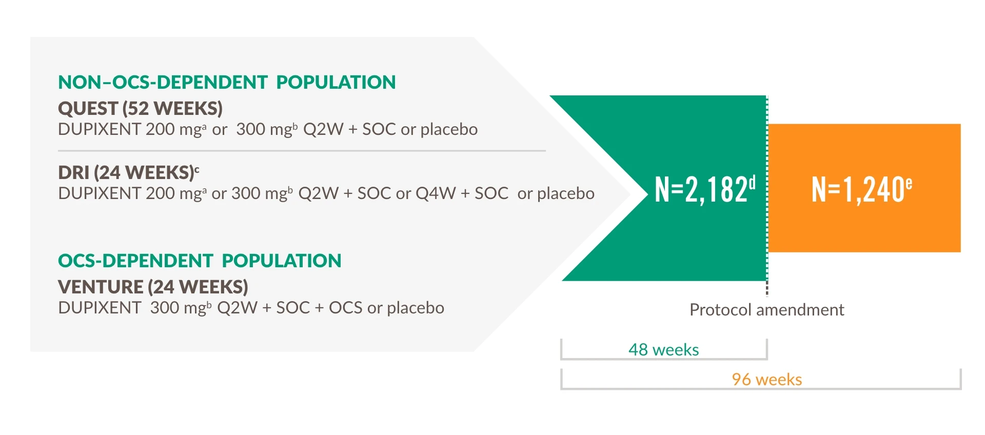 d At Week 24 of VENTURE, 48 of 90 in the DUPIXENT/DUPIXENT patient group (53.3%) and 29 of 97 in the placebo/DUPIXENT patient group (29.9%) were free of OCS treatment. Of these, 31 of 33 in the DUPIXENT/DUPIXENT patient group and 21 of 21 in the placebo/DUPIXENT patient group with available OCS dose data remained free of OCS treatment at TRAVERSE Week 48. 14 of 14 in the DUPIXENT/DUPIXENT patient group and 9 of 9 in the placebo/DUPIXENT patient group continued to be free of OCS treatment at TRAVERSE Week 96.