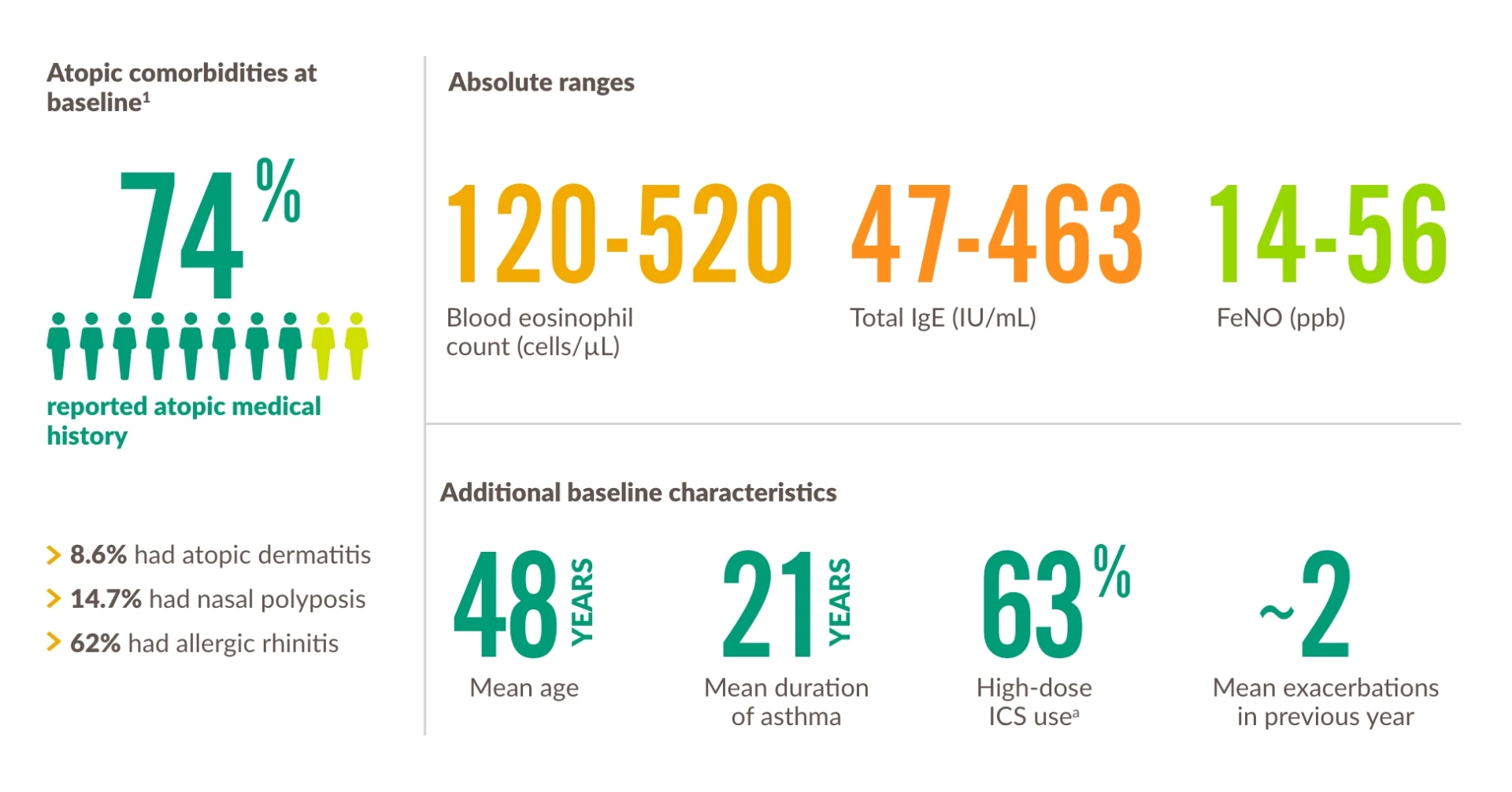 EOS 140 cells/μL; IgE 325 IU; FeNO 33 ppb