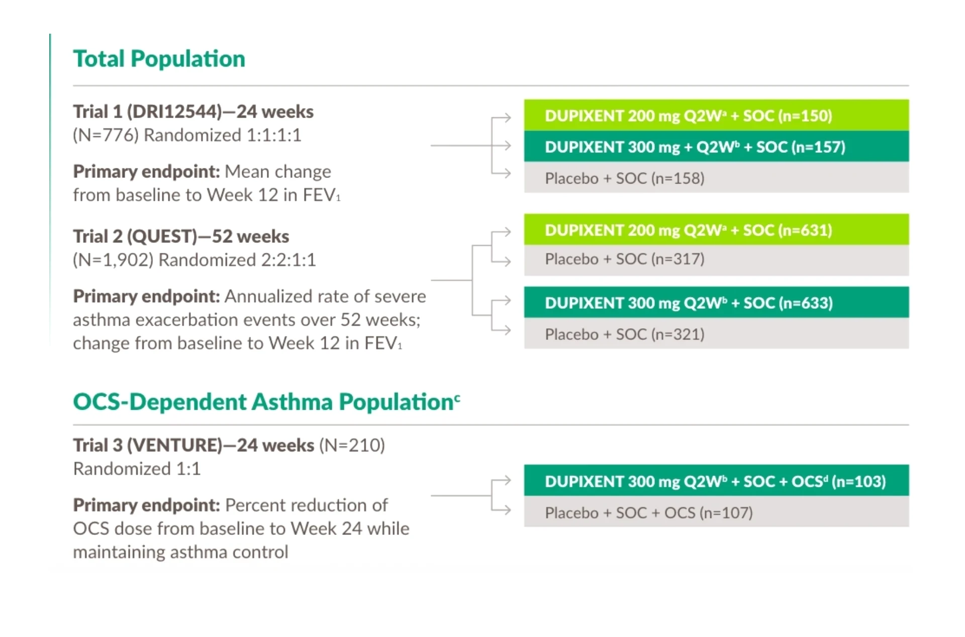 c 89% of patients from QUEST experienced zero exacerbations in Year 3 (Weeks 48-96) when treated with DUPIXENT 200 mg/300 mg Q2W + SOC (n=816) for 52 weeks in Trial 2 (QUEST) and continued with DUPIXENT 300 mg Q2W + SOC in the OLE period (other endpoint).