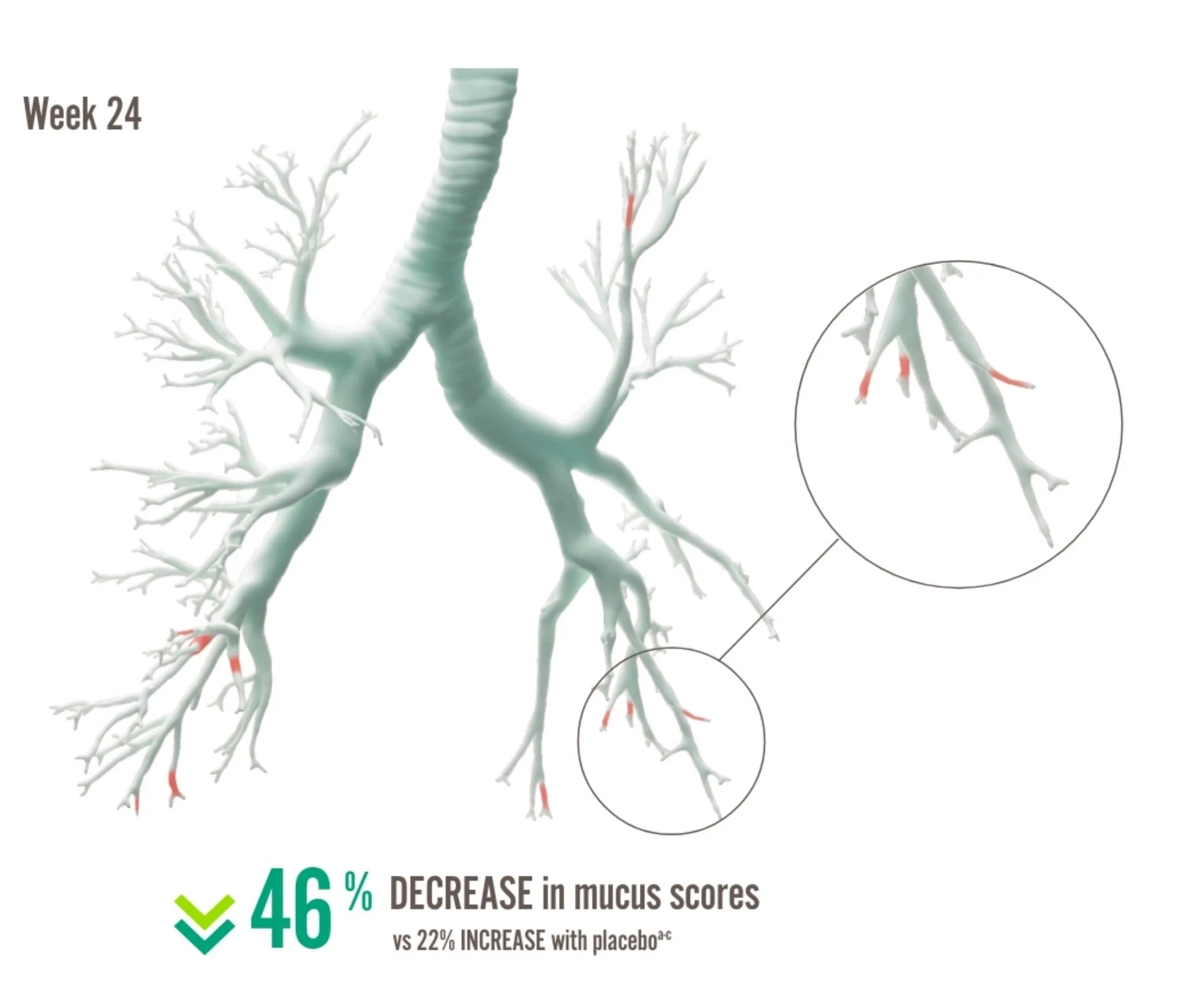 b Improvement in FEV1 at Week 2 (primary endpoint was Week 12); sustained through Week 52 (QUEST) and ~3 years (TRAVERSE OLE); exacerbation reduction through Week 52 (QUEST); reduced FeNO, mucus plugging, and airway resistance and increased airway volume at Week 24 (VESTIGE).