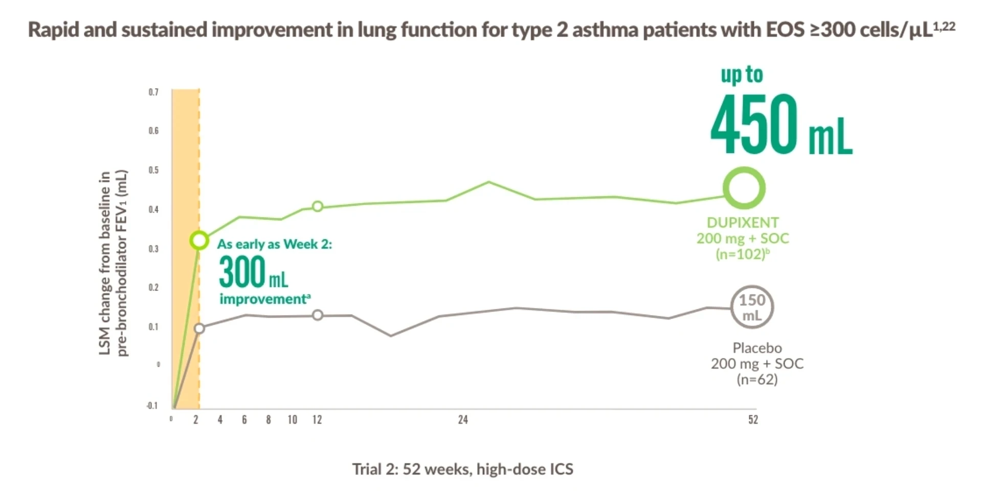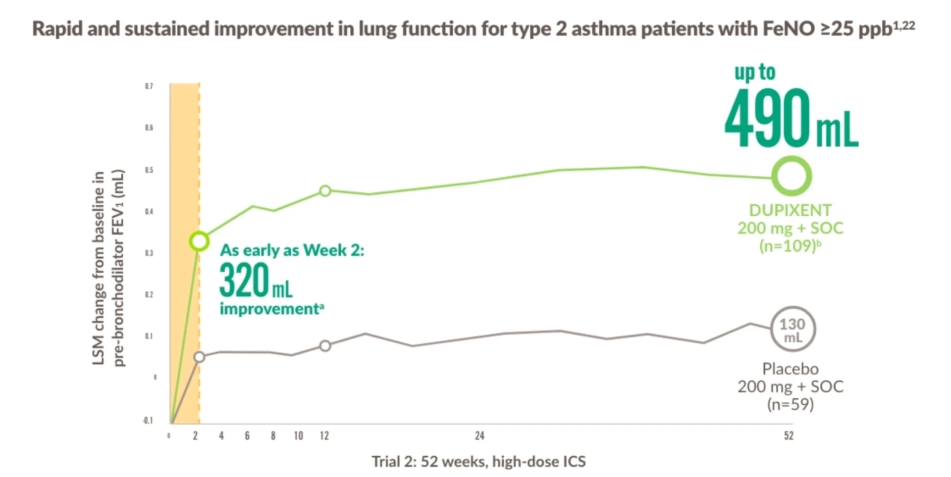 c 550 mL improvement in FEV1 at Week 52 with DUPIXENT 200/300 mg + SOC (n=69) in patients with EOS ≥300, FeNO ≥25, and allergic asthma on high-dose ICS.