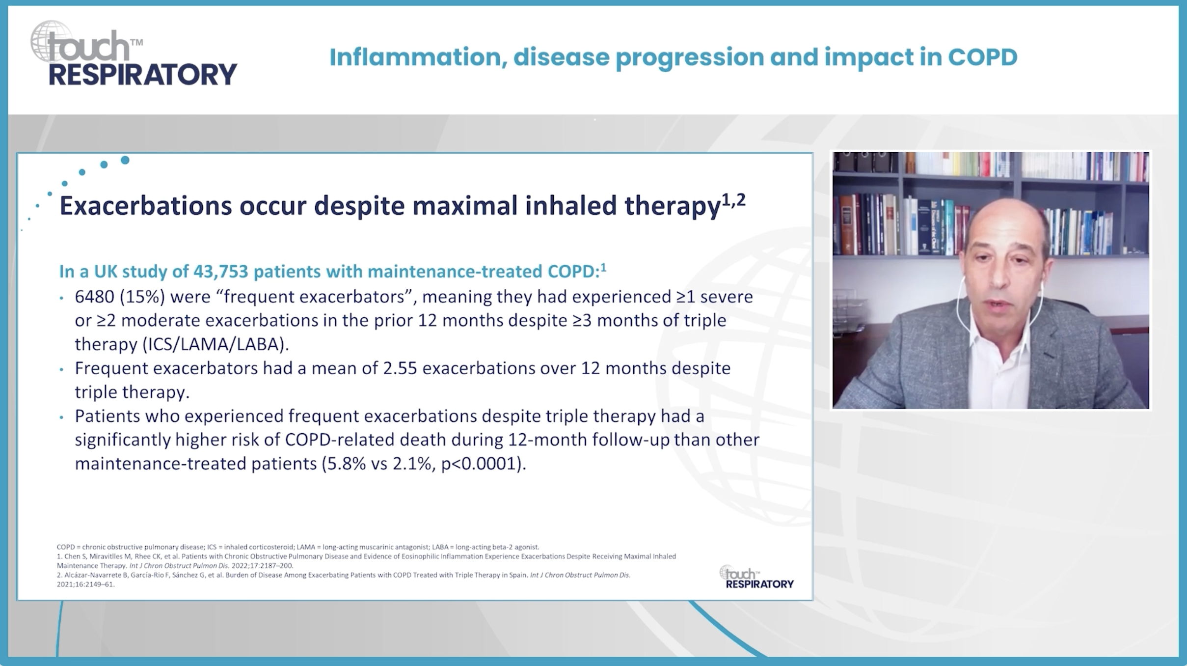 Dr. Miravitlles called attention to frequent exacerbations despite triple therapy with inhaled corticosteroids (ICS), long-acting muscarinic antagonist (LAMA) and long-acting β2 agonist (LABA), representing a crucial unmet need,12 “There are patients who despite optimal or maximal inhaled therapy are still experiencing exacerbations.”