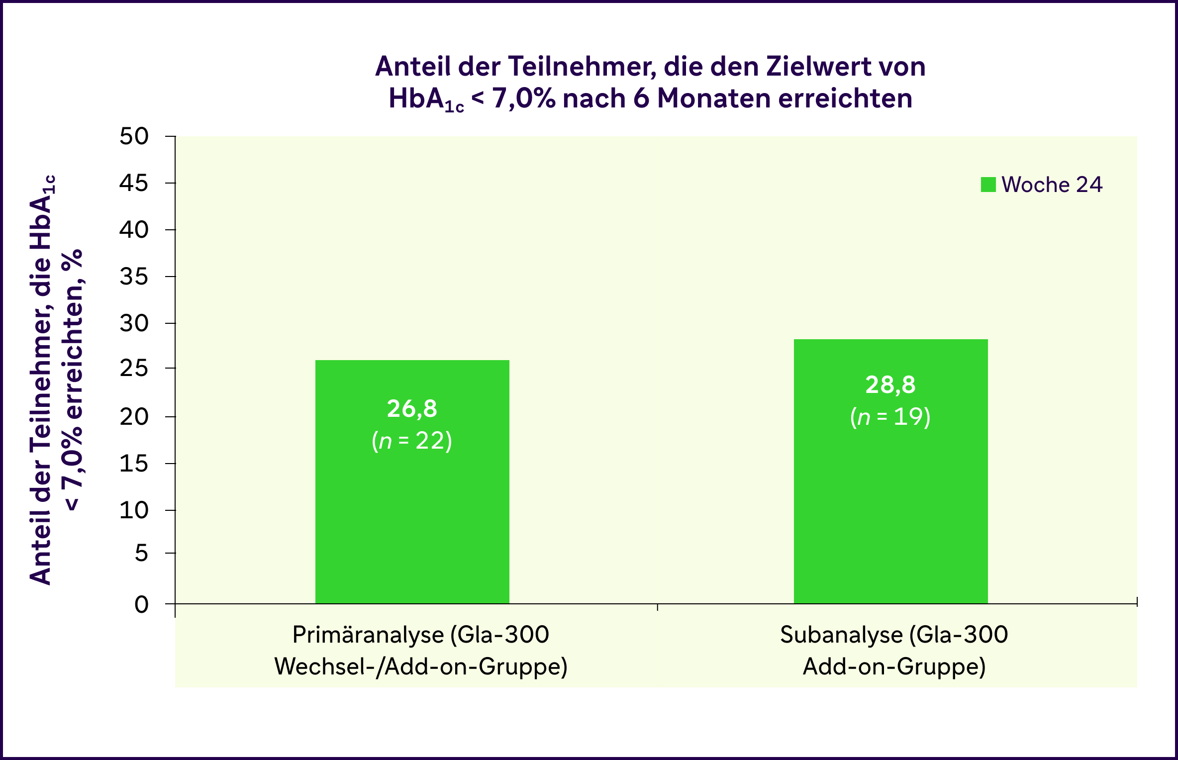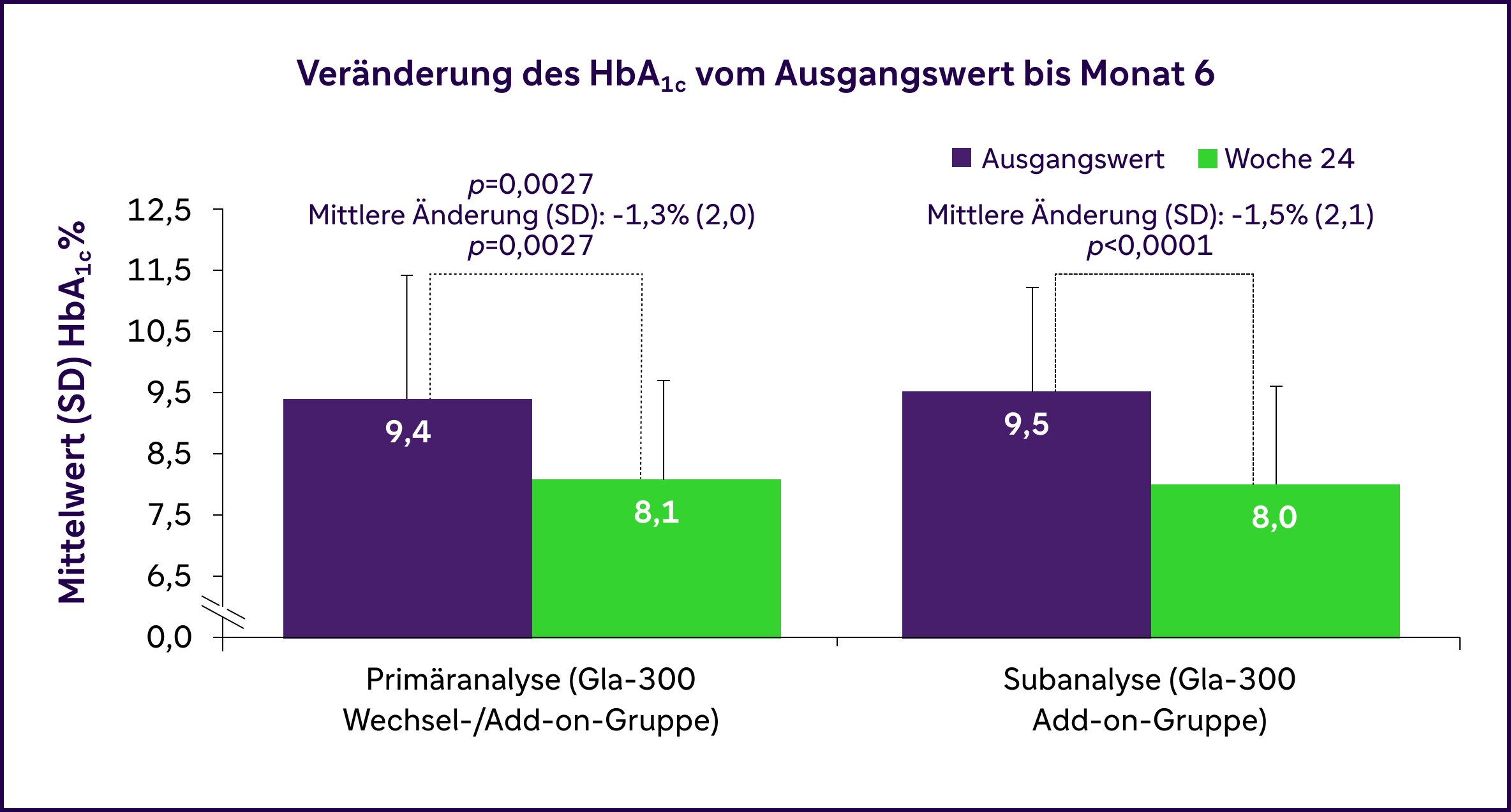 Der mittlere HbA1c-Wert in der primären Analyse statistisch signifikant um 1,3% von 9,4% zu Studienbeginn auf 8,1% nach sechs Monaten (p = 0,0027).2 In der Subanalyse der reinen Gla-300 Add-on-Gruppe fiel die Verbesserung mit minus 1,5% (p<0,0001) sogar noch deutlicher aus.2