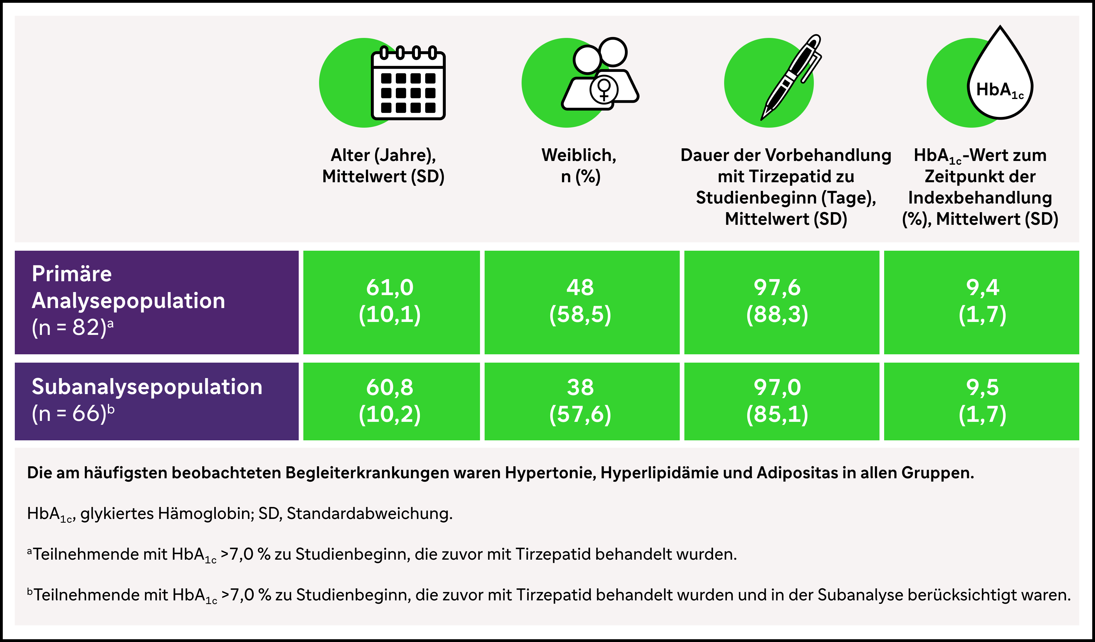 Die Forscher um Robert Ritzel vom Klinikum Schwabing analysierten Daten aus der Optum Clinformatics-Datenbank.2 Aus einer Gesamtkohorte von 111 Patient*innen wurden die Daten von 82 insulin-naiven Patient*innen mit Typ-2-Diabetes untersucht, die zuvor mit Tirzepatid behandelt worden waren und einen HbA1c-Wert über 7,0% aufwiesen.2 Das Durchschnittsalter lag zwischen 60 und 61 Jahren, und der Anteil der weiblichen Teilnehmer betrug zwischen 57,6 und 58,5%.2