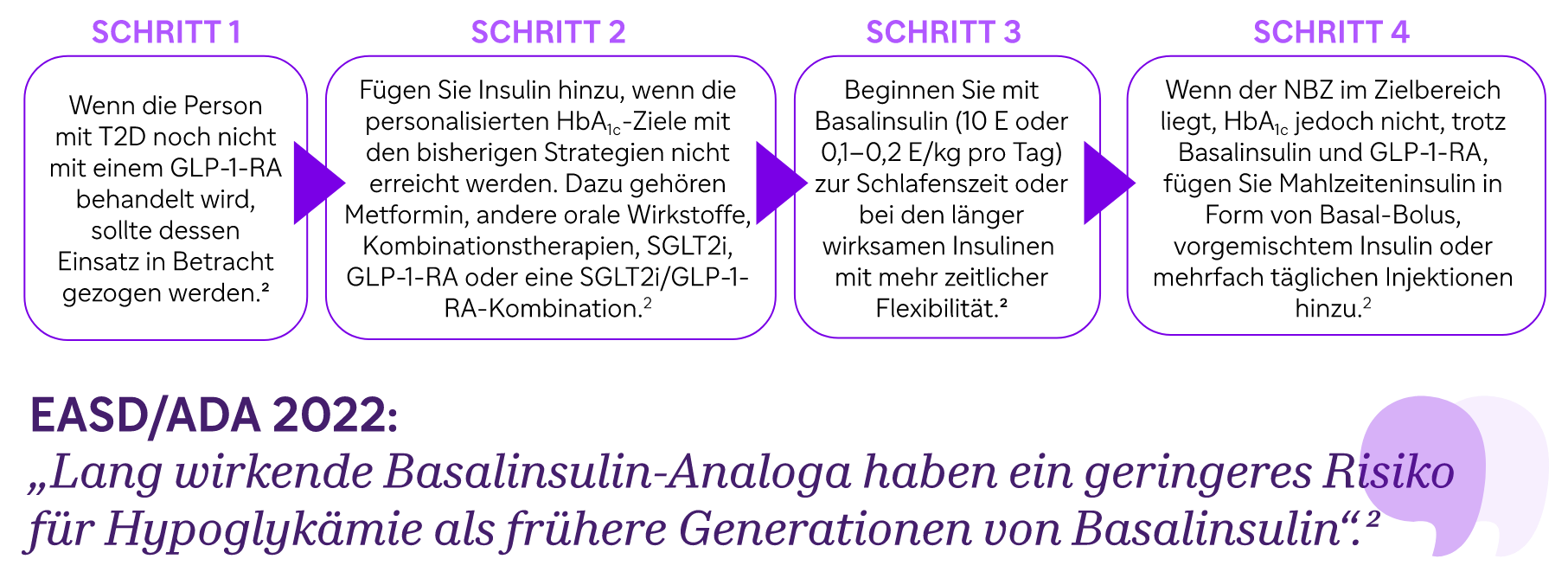 Die aktuellen EASD/ADA-Konsensusleitlinien empfehlen: „Wenn Menschen mit T2D die Zielwerte nicht erreichen und Insulin die beste Wahl für die Person ist, sollte die Insulintherapie nicht verzögert werden“.2