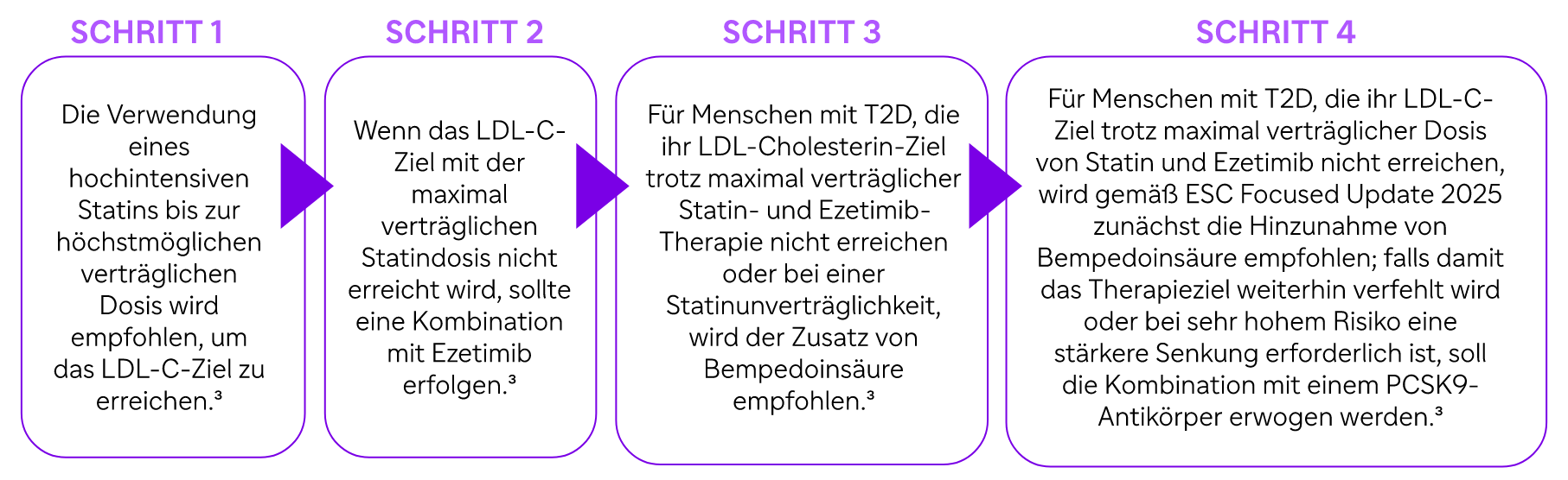 Menschen mit T2D und klinisch etablierter ASCVD werden als Personen mit sehr hohem Risiko definiert, und diese Personen sollten einen LDL-C-Zielwert von < 55 mg/dl anstreben und eine Reduktion von mindestens 50 %.‡‡,3