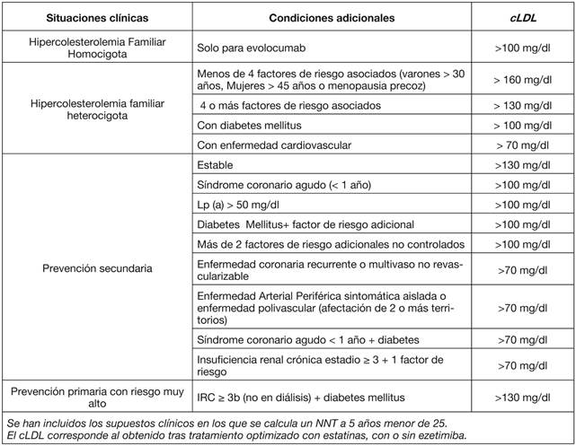 - Cualquiera de los pacientes de los grupos anteriores que sean intolerantes a las estatinas o en los que las estatinas están contraindicadas y cuyo cLDL sea superior a 100 mg/dl3.