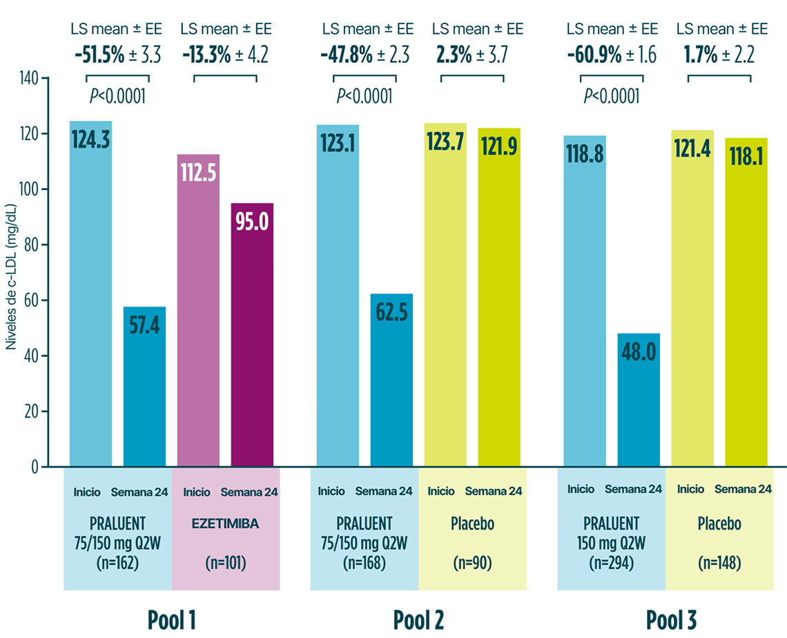 La administración de PRALUENT se asoció con una reducción significativamente mayor de los niveles de c-LDL en la Semana 24 en los tres pools analizados¹.