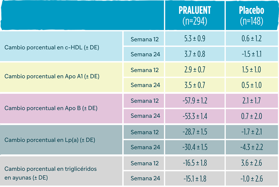 Desde el inicio hasta la Semana 12, PRALUENT se asoció con una mejora significativa en el porcentaje de cambio del c-LDL calculado, ApoB y Lp(a) frente a ezetimiba o placebo¹.