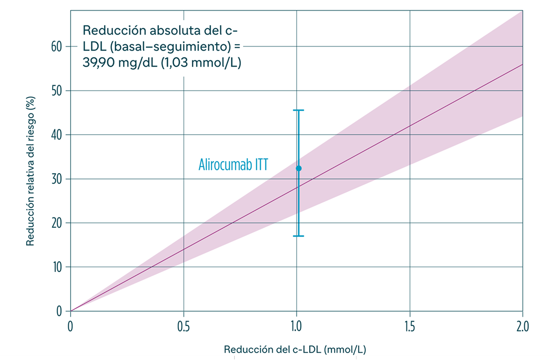 Estos hallazgos son coherentes con los resultados del Cholesterol Treatment Trialists’ Collaboration, que demostraron una fuerte asociación entre la reducción relativa del riesgo de MACE por cada reducción de 1 mmol/L en c-LDL.6