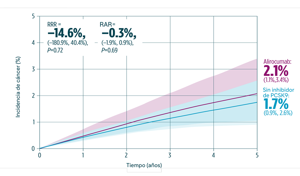 Para ayudar a demostrar que la menor tasa de MACE observada con alirocumab frente a no inhibidor de PCSK9 no estuvo influida por otros factores, el estudio evaluó si el tratamiento con alirocumab frente a no inhibidor de PCSK9 se asociaba con algún beneficio inesperado en variables de control negativo, como el cáncer. La incidencia de cáncer fue similar en el grupo tratado con alirocumab (2,1%) y en el grupo sin inhibidor de PCSK9 (1,7%) (P=0,69), lo que indica una confusión residual mínima y respalda la validez de los datos de MACE.1