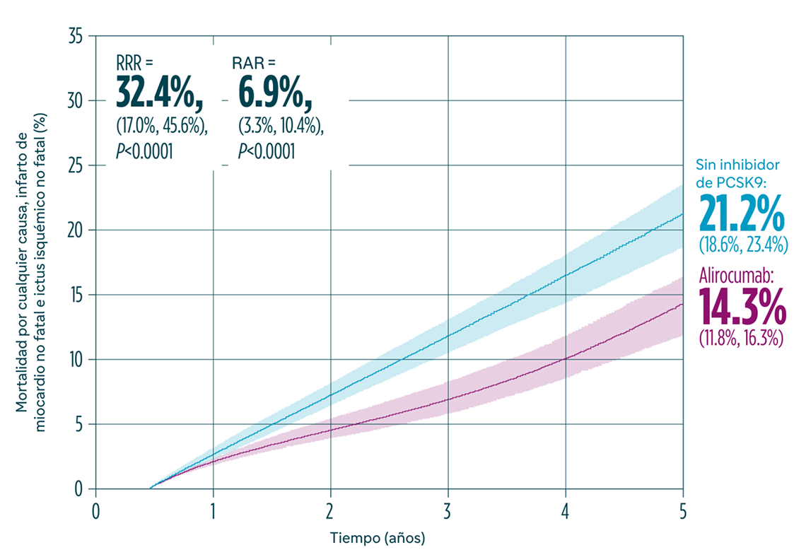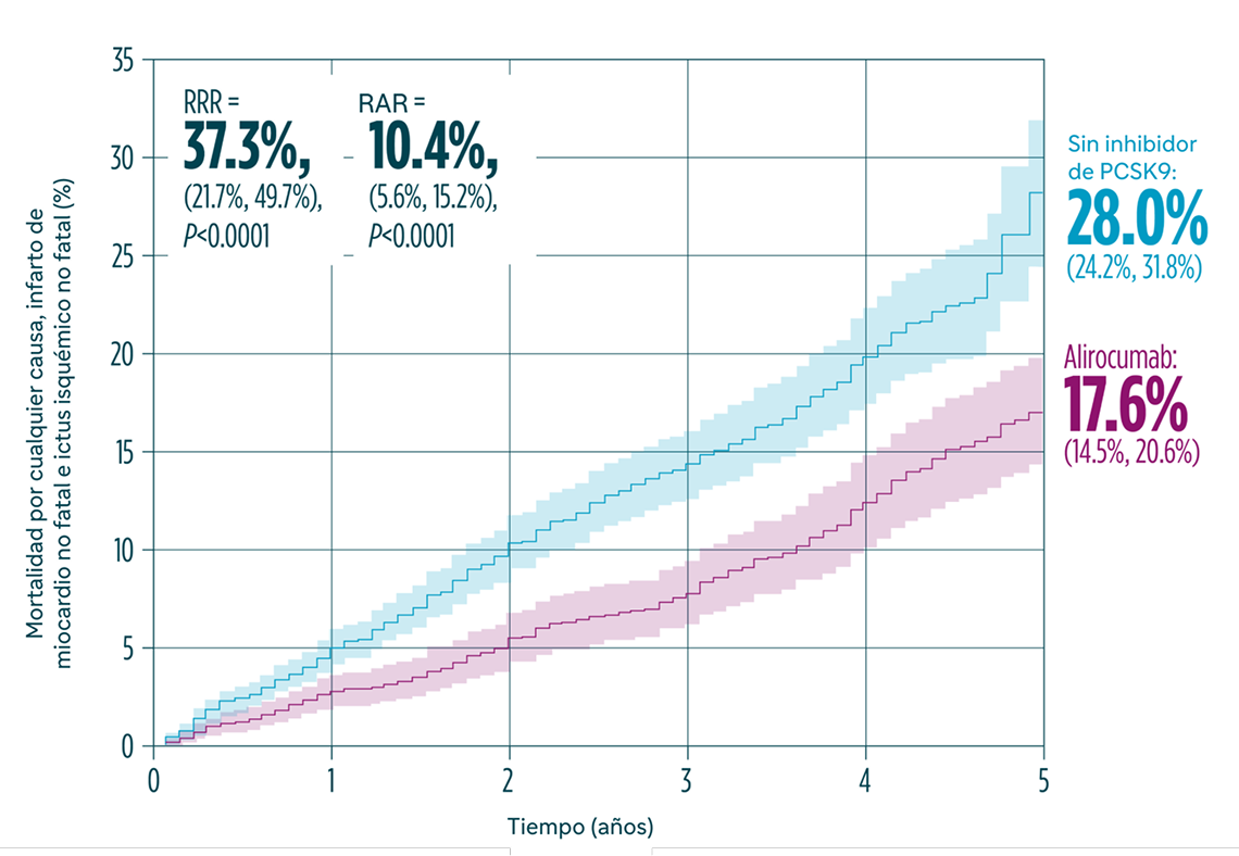 En conjunto, se observó una tasa significativamente menor de la variable principal (compuesto de mortalidad por cualquier causa, infarto de miocardio no fatal e ictus isquémico no fatal) en el grupo tratado con alirocumab frente al grupo sin inhibidor de PCSK9.1