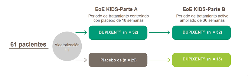 oSe estudió un brazo de exposición más baja de DUPIXENT® en la Parte A (n = 26) y Parte B (n = 36), pero no está aprobado para el tratamiento de la EEo.16