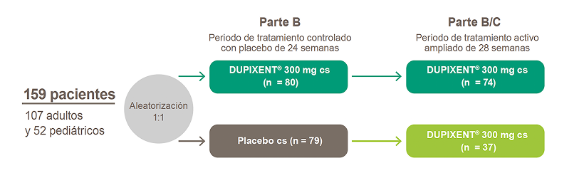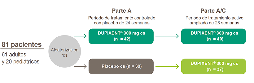 Dos estudios controlados con placebo, doble ciego de 24 semanas.15 Los pacientes fueron aleatorizados a recibir DUPIXENT® 300 mg cs, DUPIXENT® 300 mg c2s (solo Partes B y B-C) o placebo csm