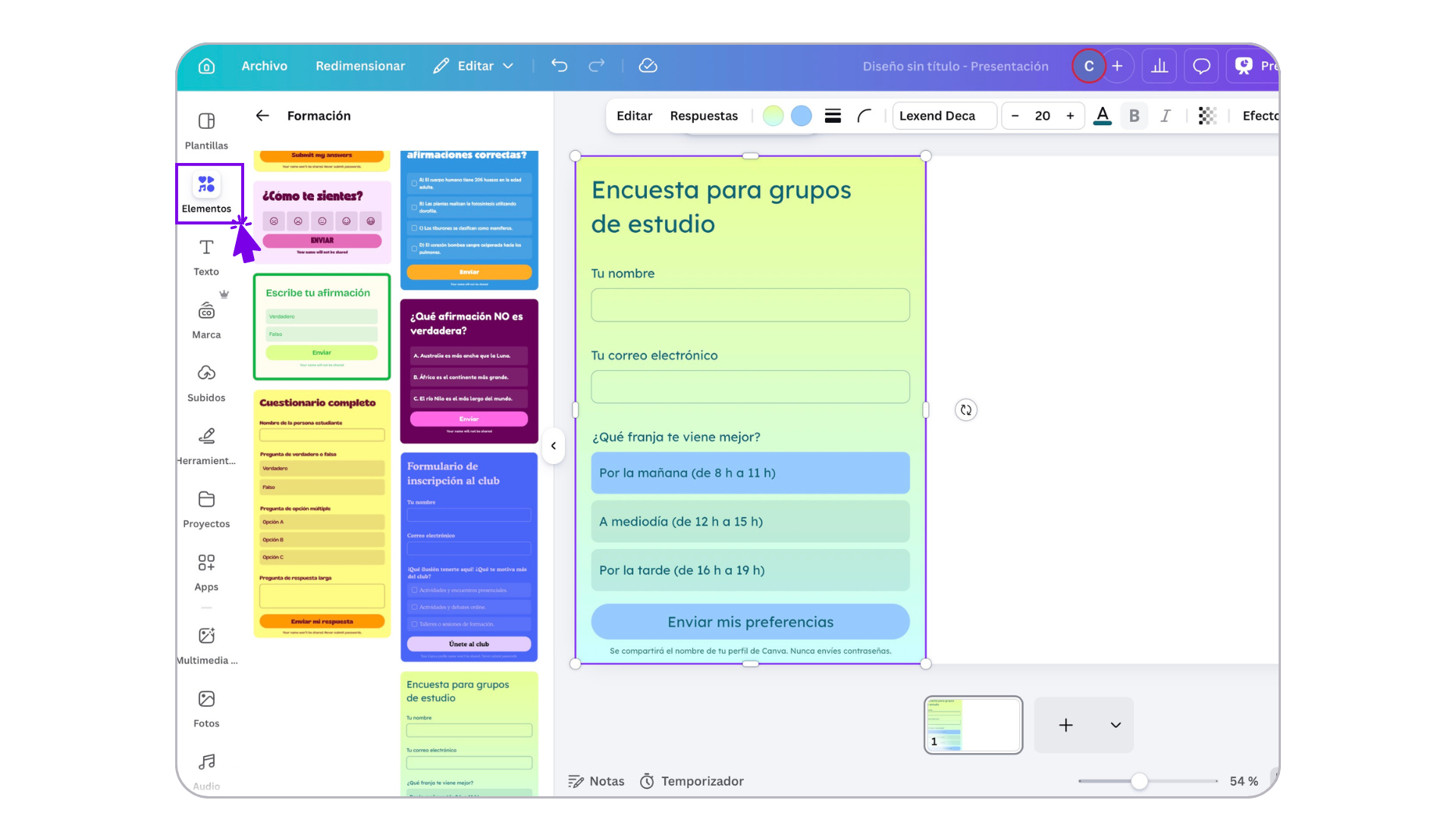 - Funciona dentro de cualquier diseño de Canva: presentaciones, documentos, webs, formularios.