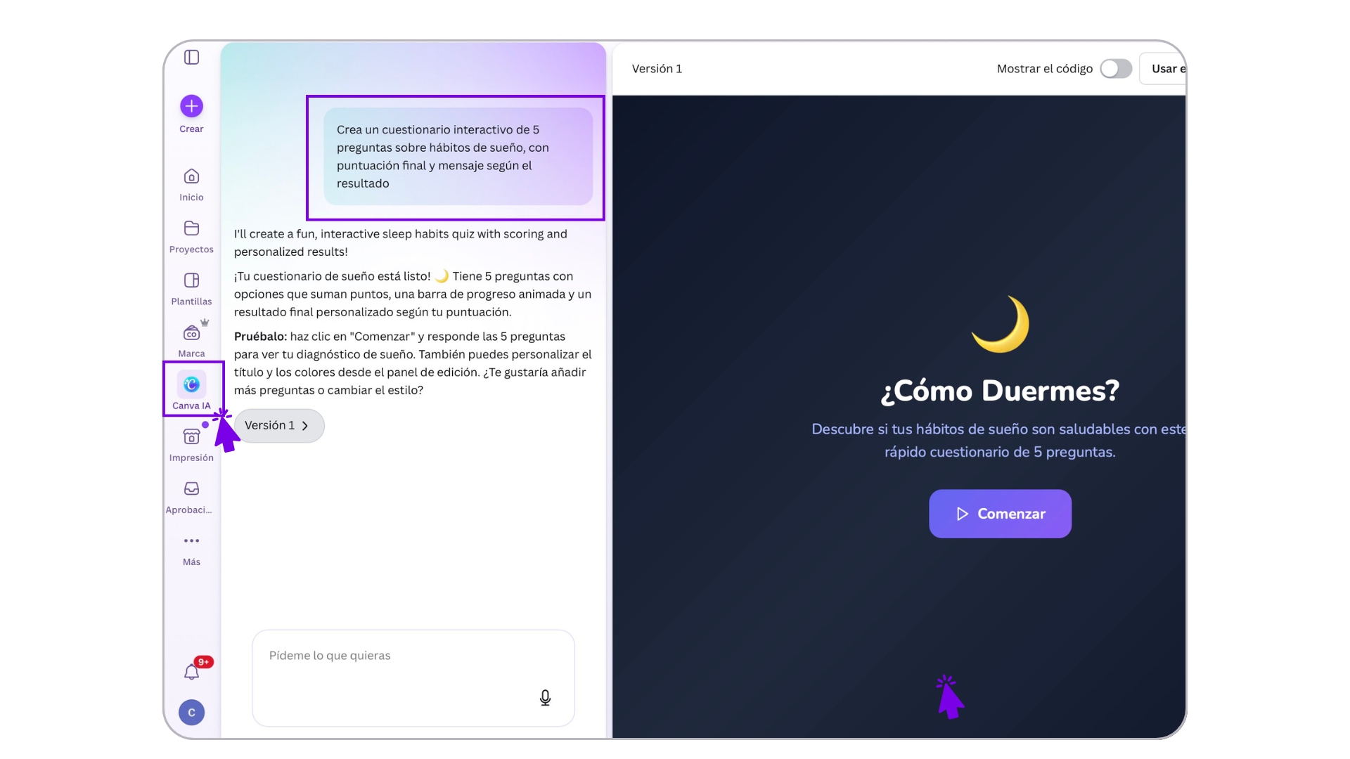 - Describe la app que quieres crear. Ejemplo: 'Crea un cuestionario interactivo de 5 preguntas sobre hábitos de sueño, con puntuación final y mensaje según el resultado'.