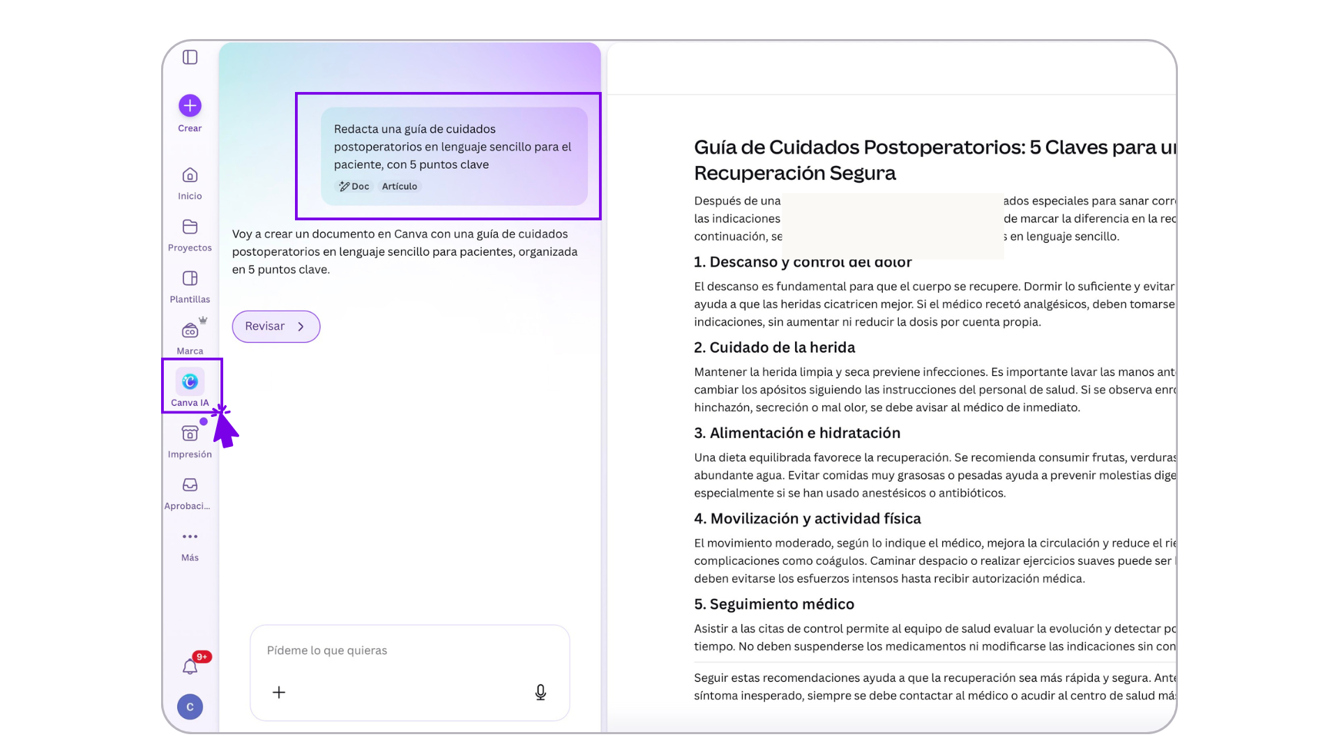 - Describe el contenido que necesitas. Ejemplo: 'Redacta una guía de cuidados postoperatorios en lenguaje sencillo para el paciente, con 5 puntos clave'.