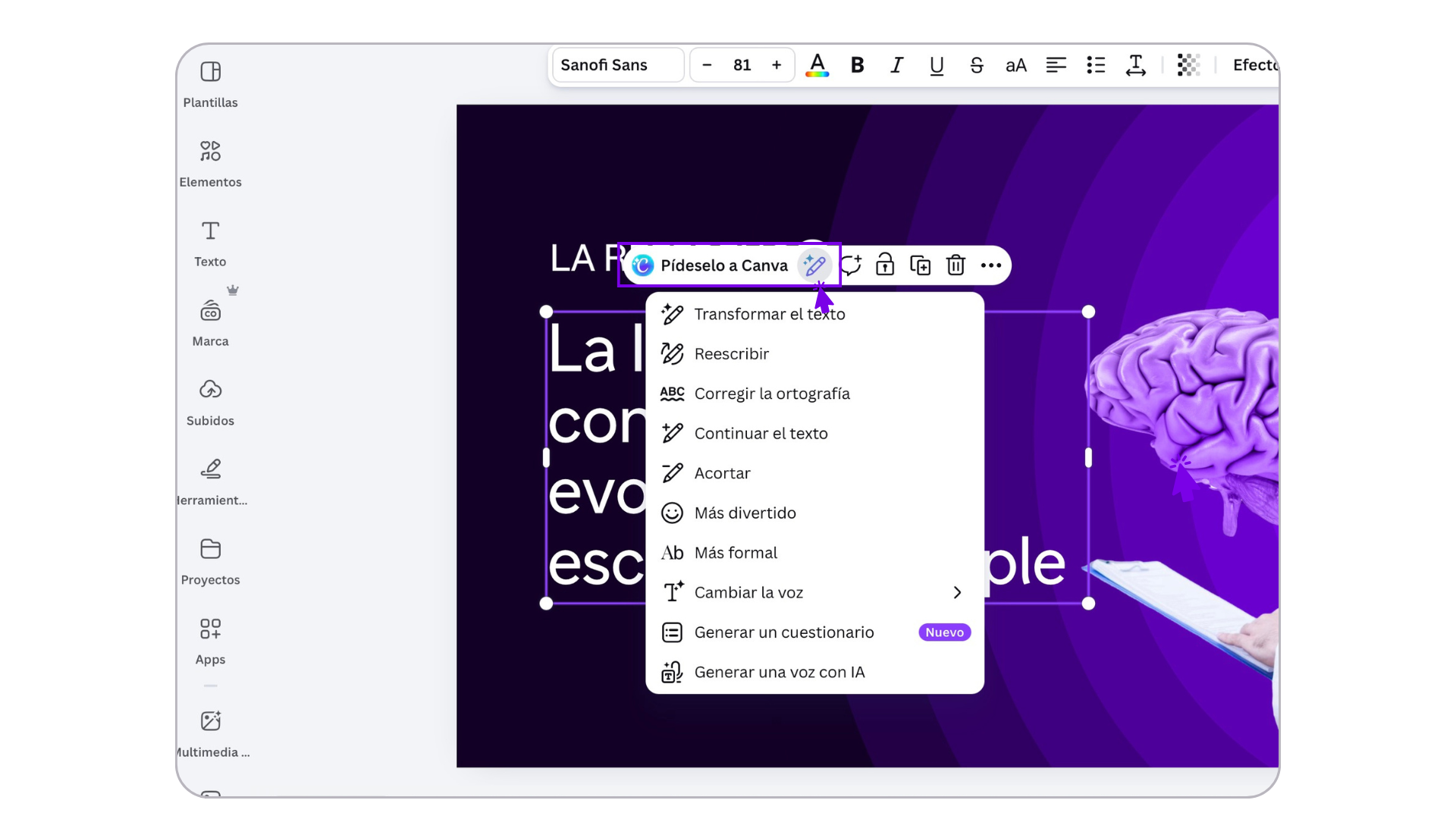 - Revisa el texto generado, ajústalo con nuevas instrucciones si es necesario, e insértalo en tu diseño.