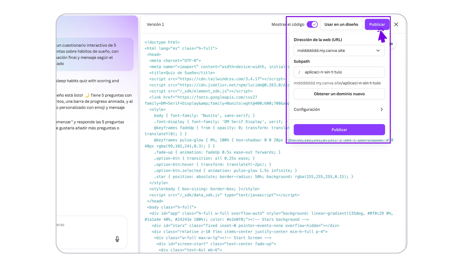 Canva Code es la funcionalidad de IA de Canva que permite generar aplicaciones interactivas funcionales a partir de un simple prompt de texto, sin escribir ni una sola línea de código. Presentada en abril de 2025 durante el evento Canva Create y desarrollada en colaboración con Anthropic, permite crear desde calculadoras de índices de salud y cuestionarios de valoración de síntomas hasta juegos educativos sobre hábitos de vida o simuladores de seguimiento, todo ello en pocos minutos.