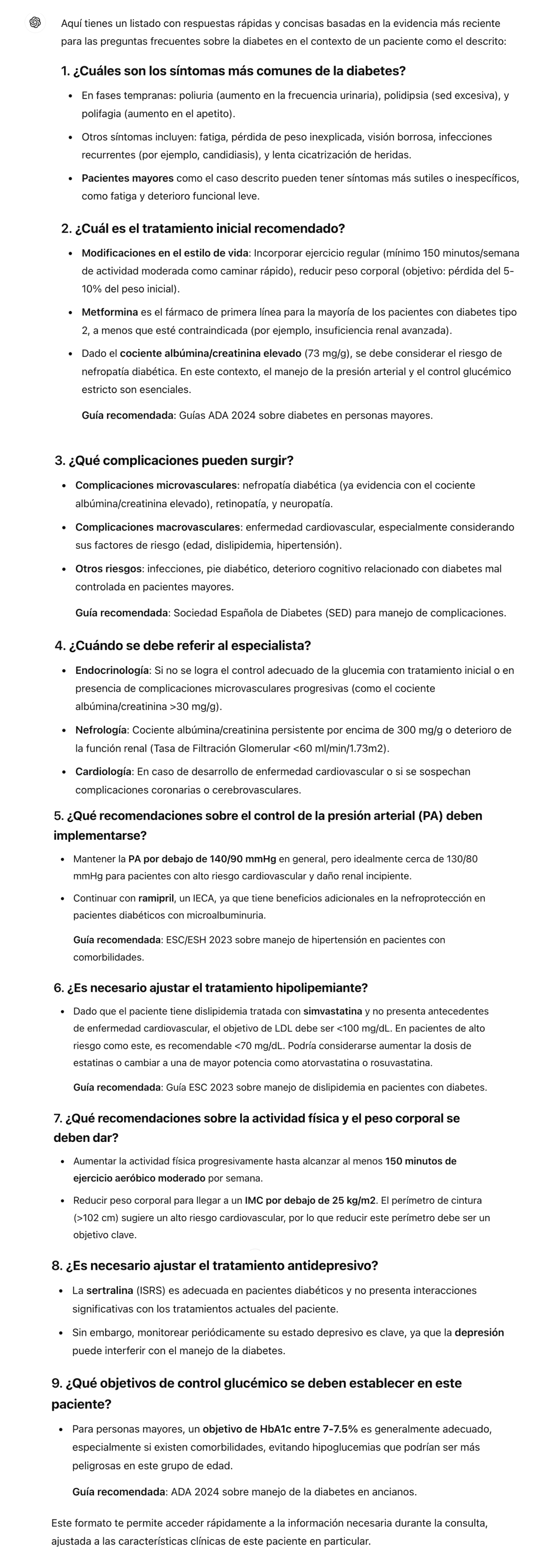 - Prioridad moderada: Control del riesgo cardiovascular mediante mejoras en la actividad física y la dieta, manejo del peso, y seguimiento de la glucosa (HbA1c y glucemia en ayunas).
