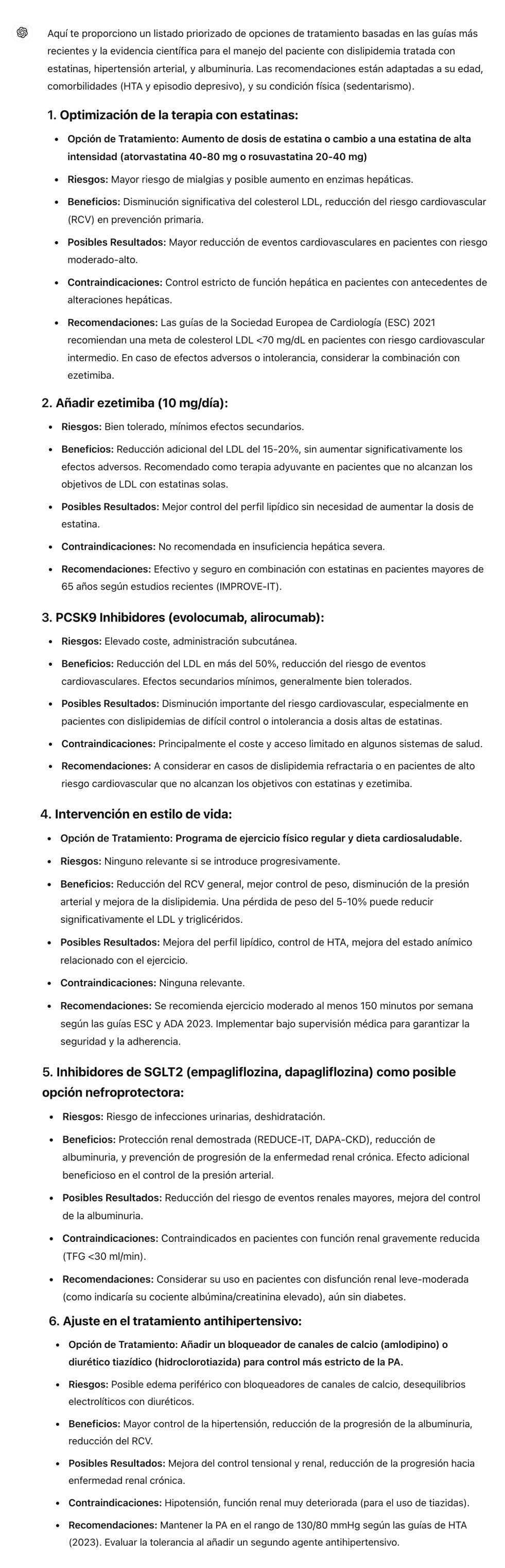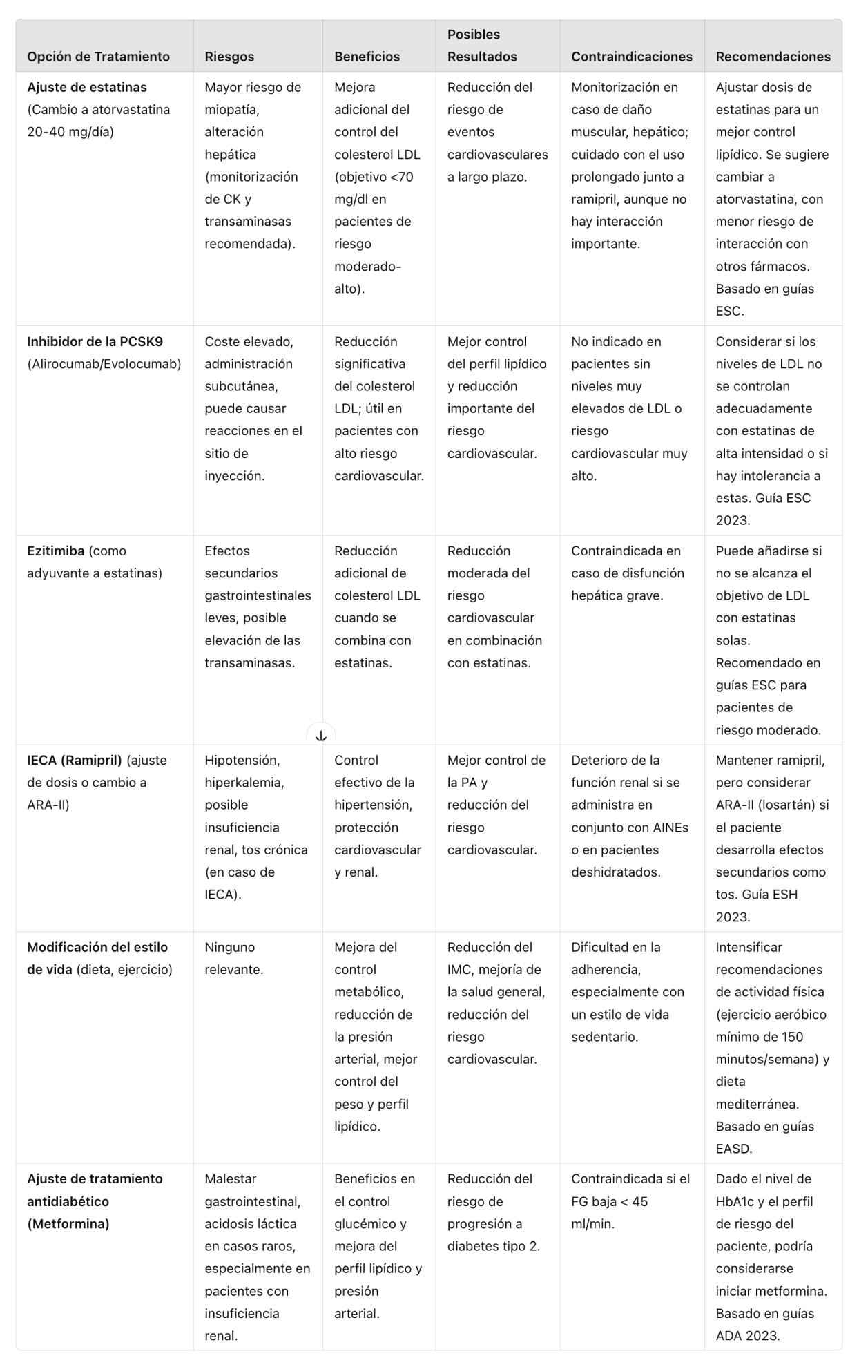 "Aquí te presento una tabla comparativa de las opciones de manejo para el paciente considerando su dislipidemia, hipertensión arterial, y el riesgo cardiovascular, además del tratamiento farmacológico actual y sus comorbilidades. Las recomendaciones están basadas en guías clínicas actualizadas (p. ej., Sociedad Española de Cardiología, NICE, Sociedad Española de Diabetes) y evidencia científica reciente."