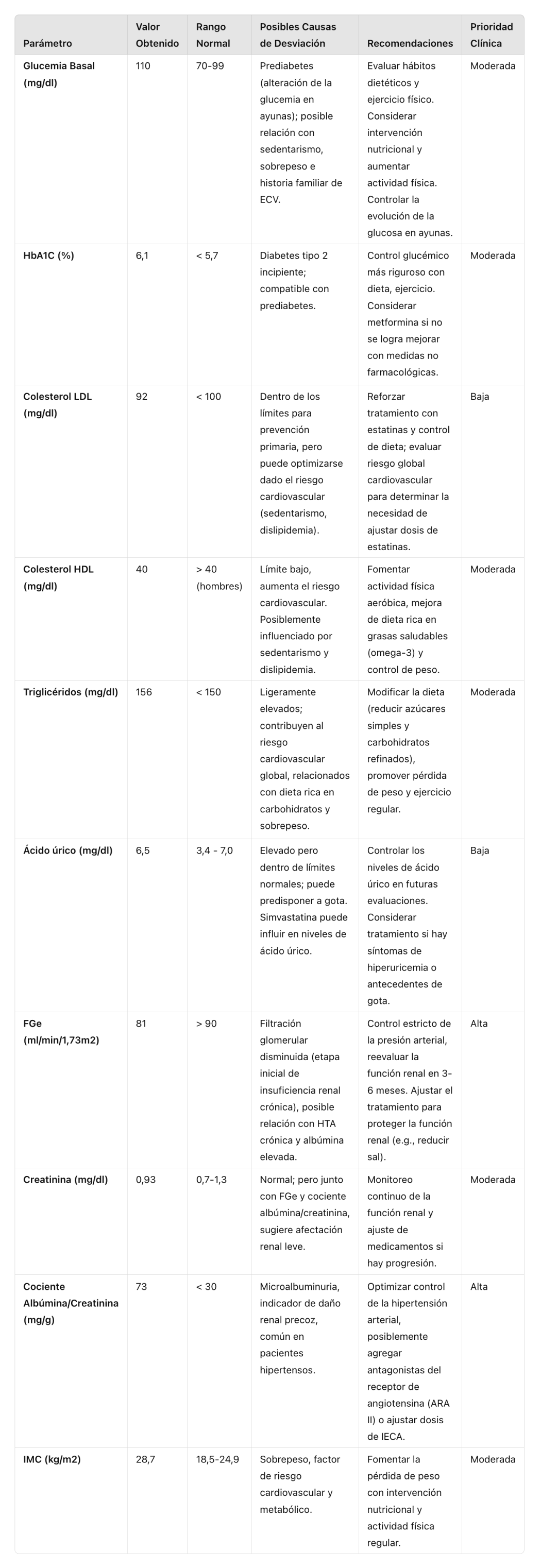 - Prioridad baja: Los valores de lípidos están razonablemente controlados bajo tratamiento, pero podrían optimizarse más con cambios en el estilo de vida.