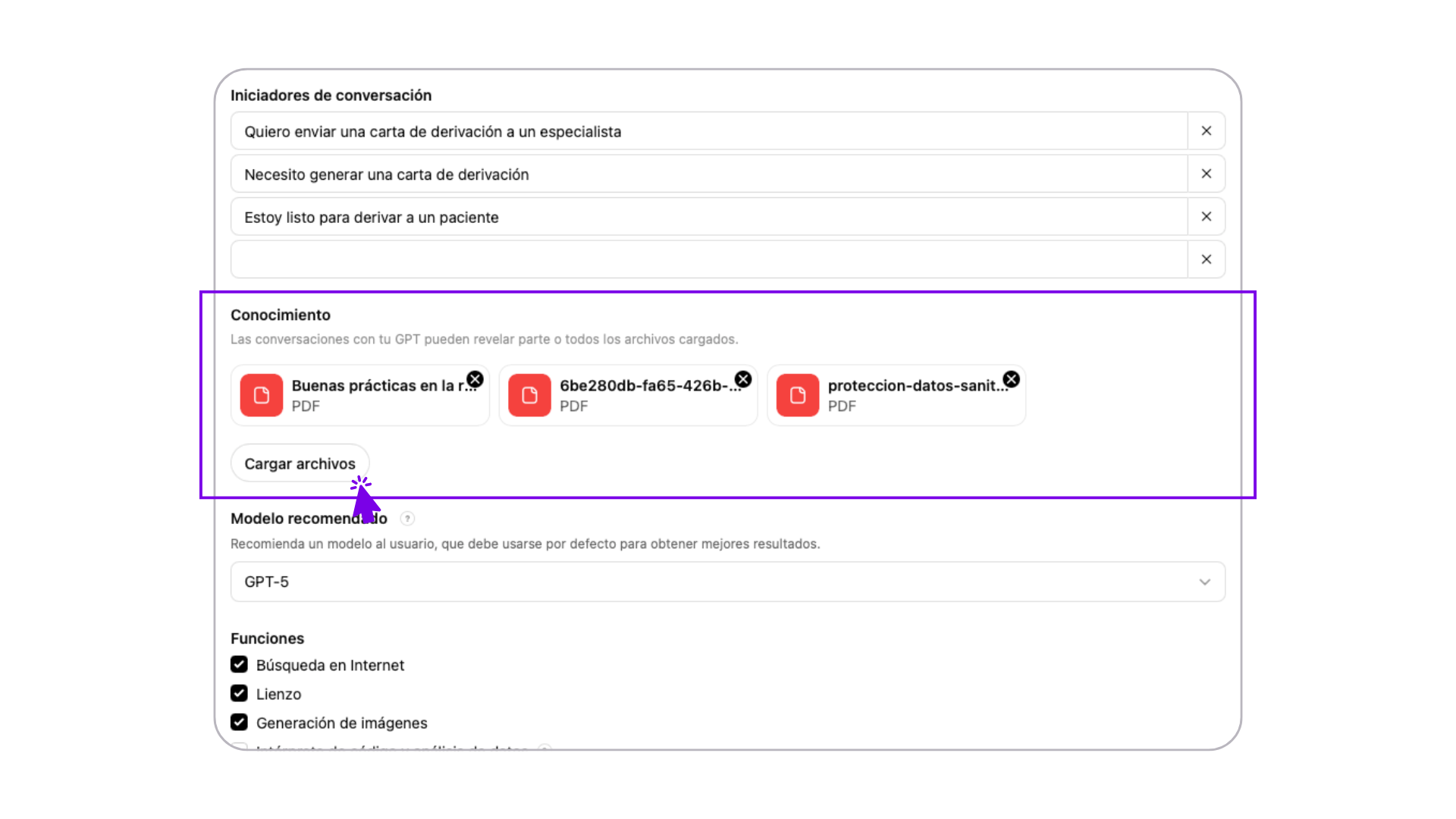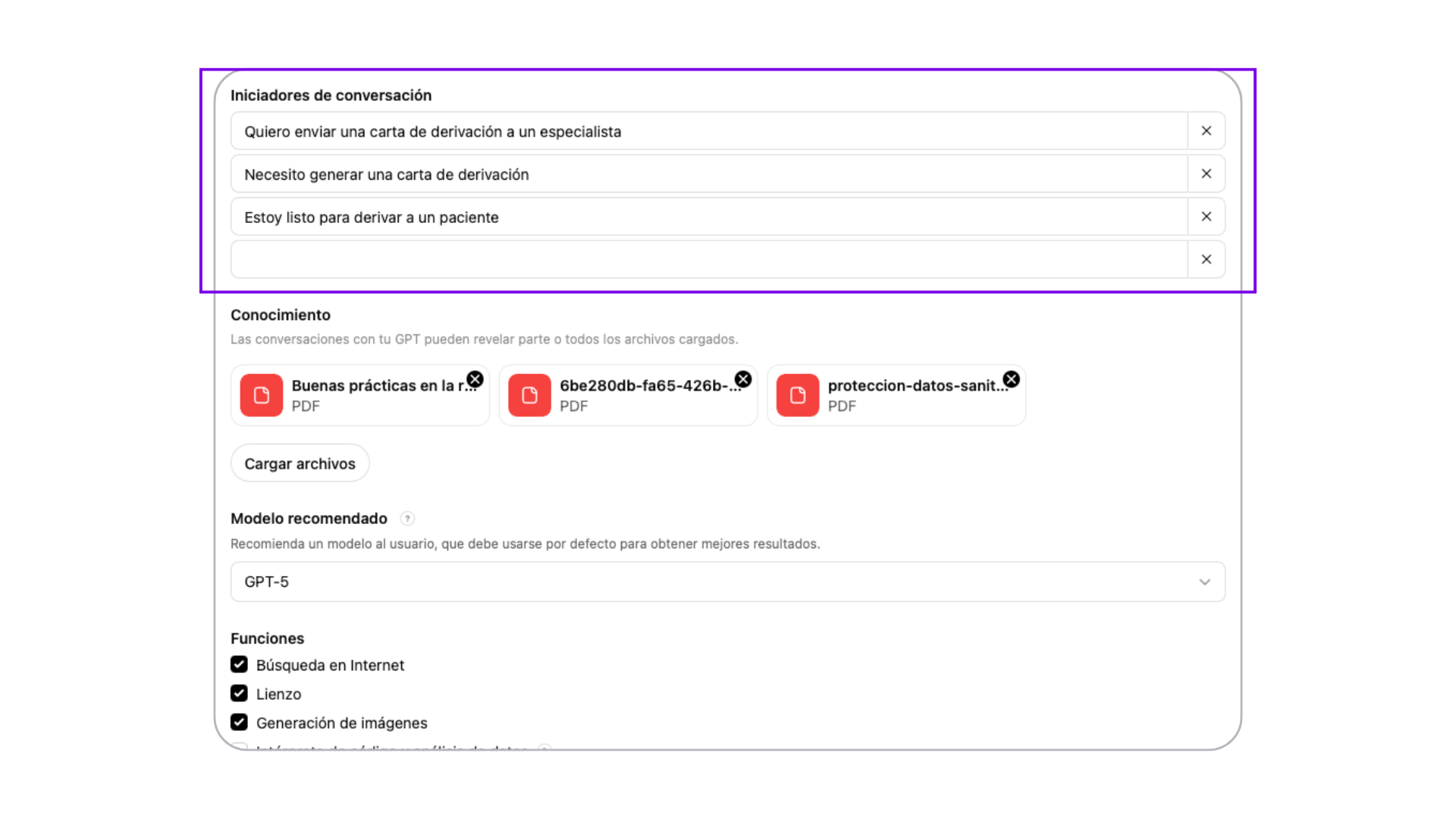 En nuestro ejemplo, hemos subido documentos como normativa española sobre protección de datos digitales, una guía sobre la correcta redacción médica y una plantilla de carta de derivación. Te recomendamos añadir tus propios documentos en la sección Conocimientos del GPT.