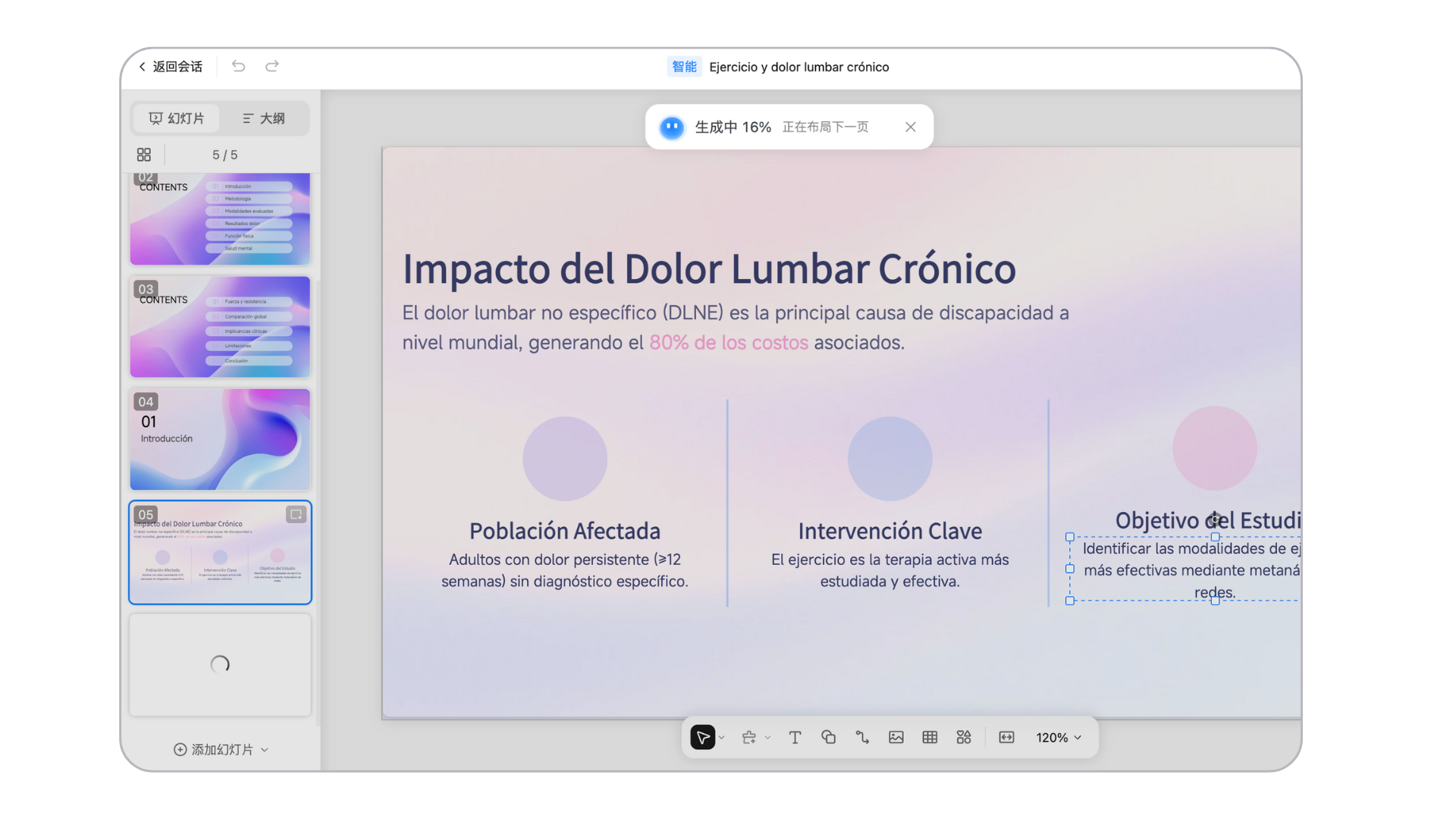 8. KIMI AI comenzará a generar la presentación médica en base a la información proporcionada en tiempo real. Podrás ver como crea y organiza la información en casa una de las slides. Es importante que permanezcas en la página hasta que termine el proceso.