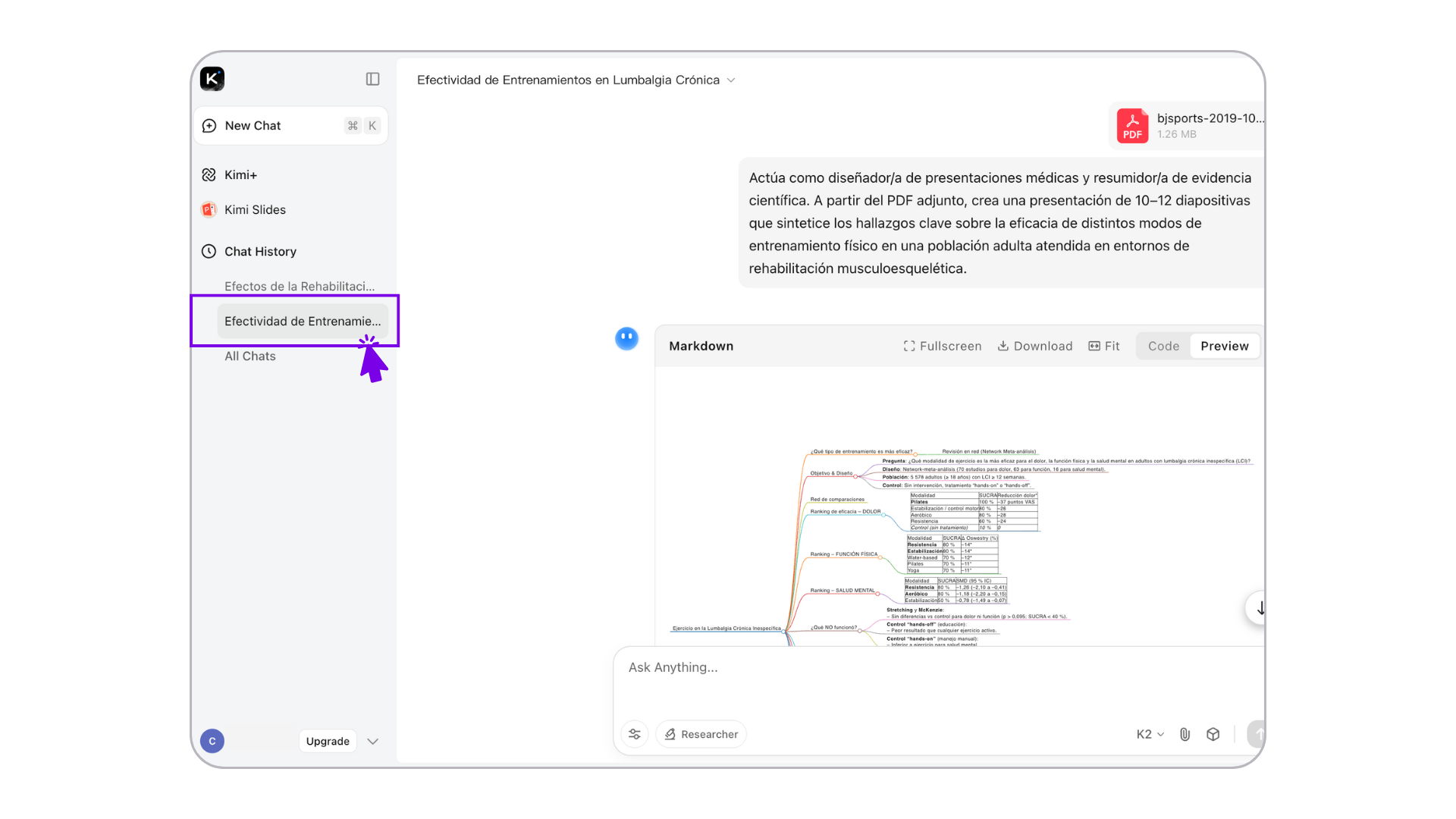 9. KIMI es una herramienta de IA que ofrece diversas funcionalidades adicionales que pueden complementar tu presentación médica, desde preguntas sobre el documento adjuntado o el texto pegado hasta generación de flujos de información relevante.