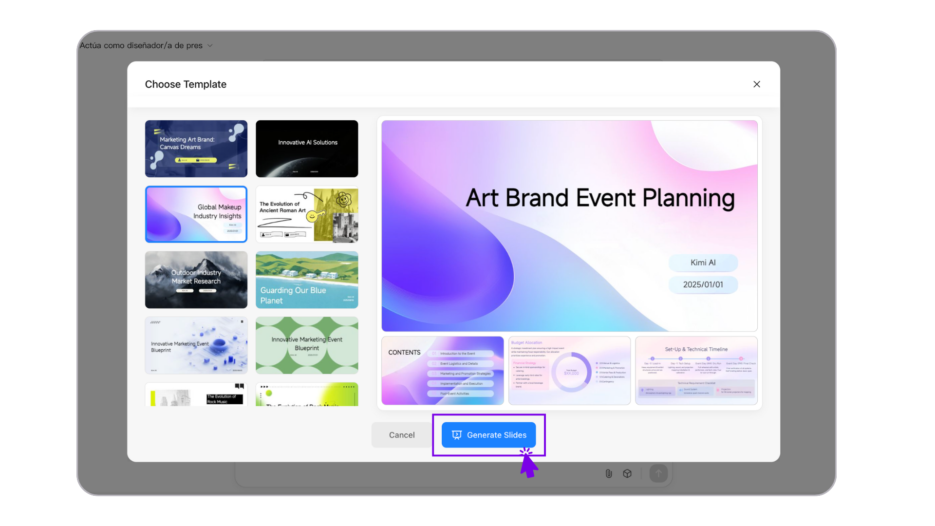 7. Al seleccionar una de las dos opciones se abrirá una ventana emergente con distintas opciones de diseño para tu presentación médica. Selecciona el que mejor encaje con tu objetivo y haz clic en "Generate Slides”