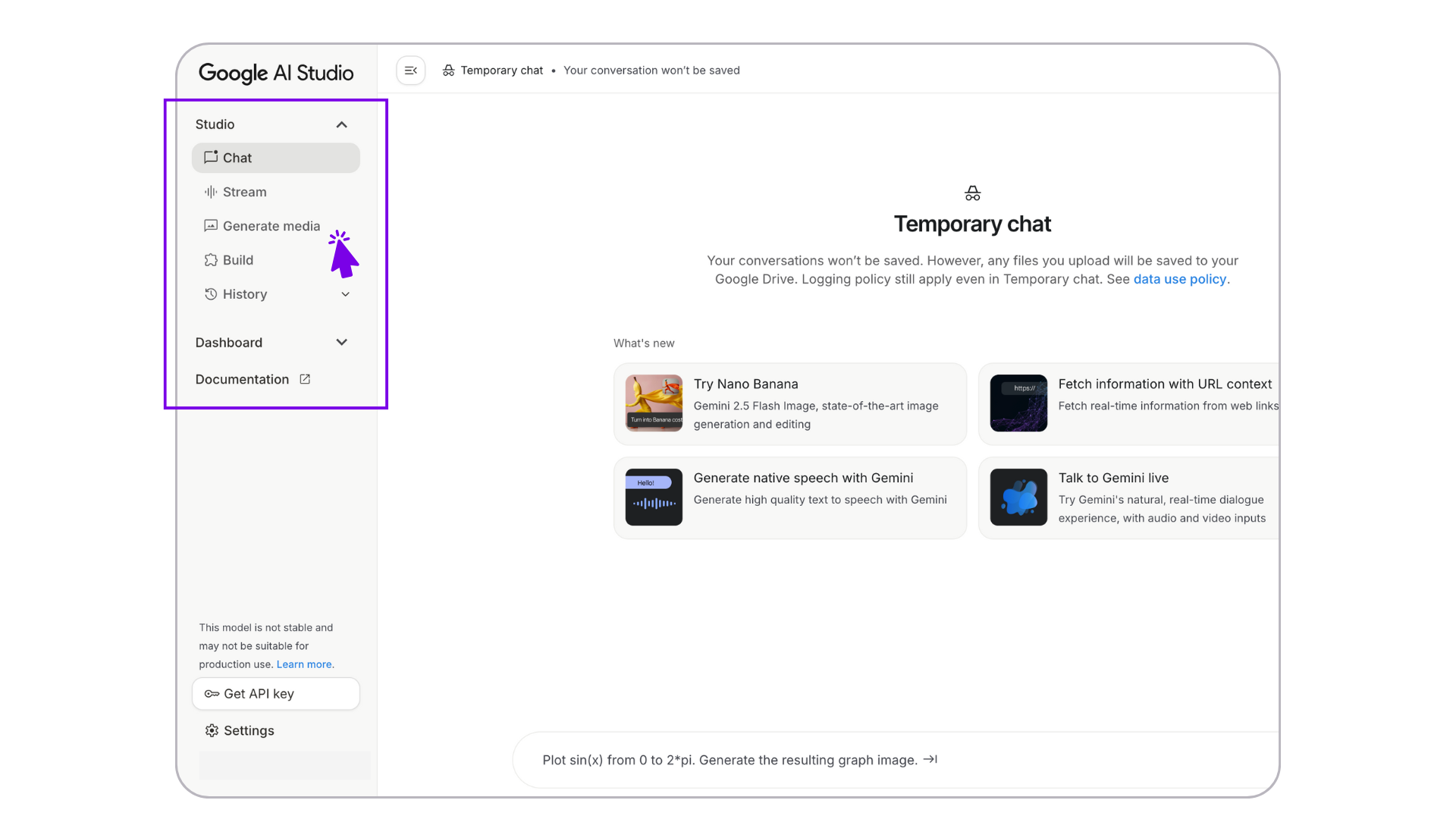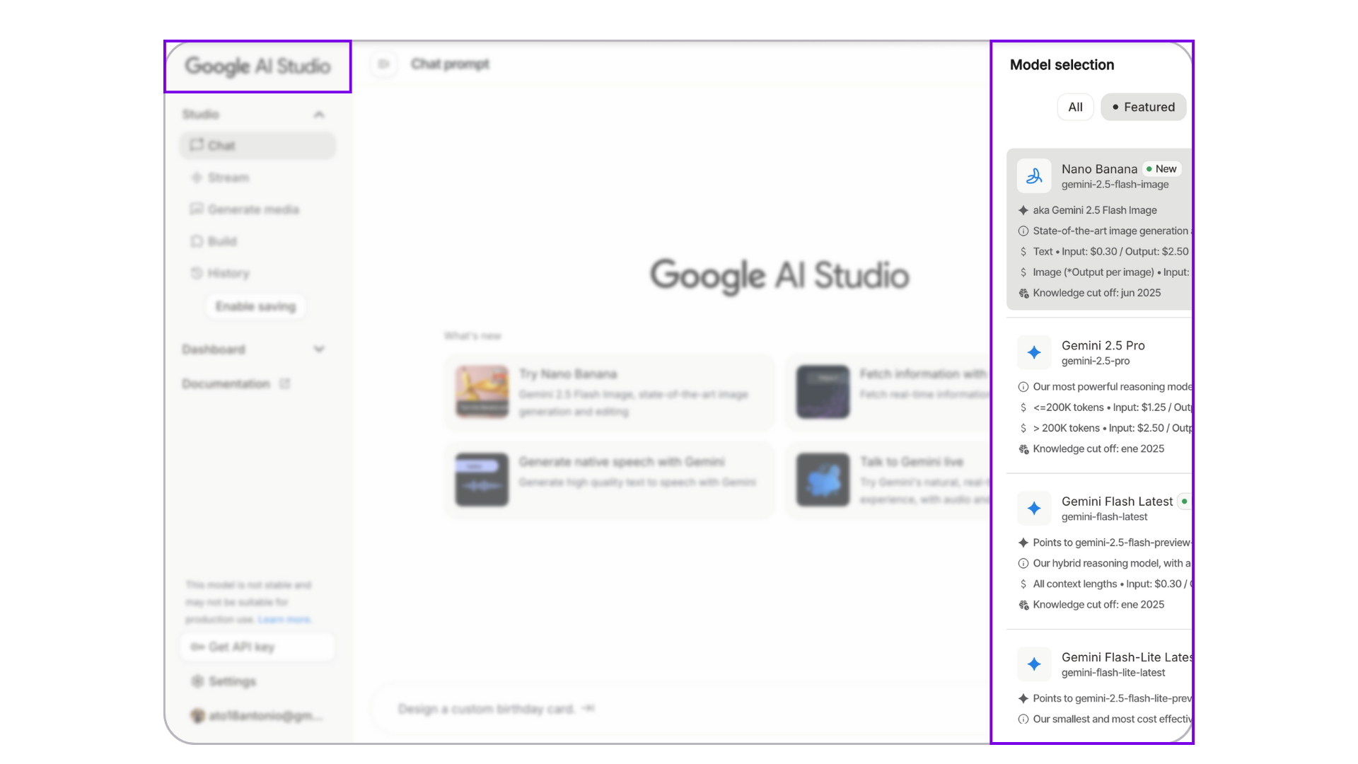 Google AI Studio es el entorno web de Google para experimentar y construir con la familia de modelos de Inteligencia artificial de Gemini. Desde una interfaz tipo chat o a partir de plantillas de prompt, se pueden seleccionar modelos (texto, audio o imagen), ajustar parámetros, subir imágenes de referencia, pedir variaciones y realizar ediciones guiadas por instrucciones. También permite gestionar claves de la Gemini API.
