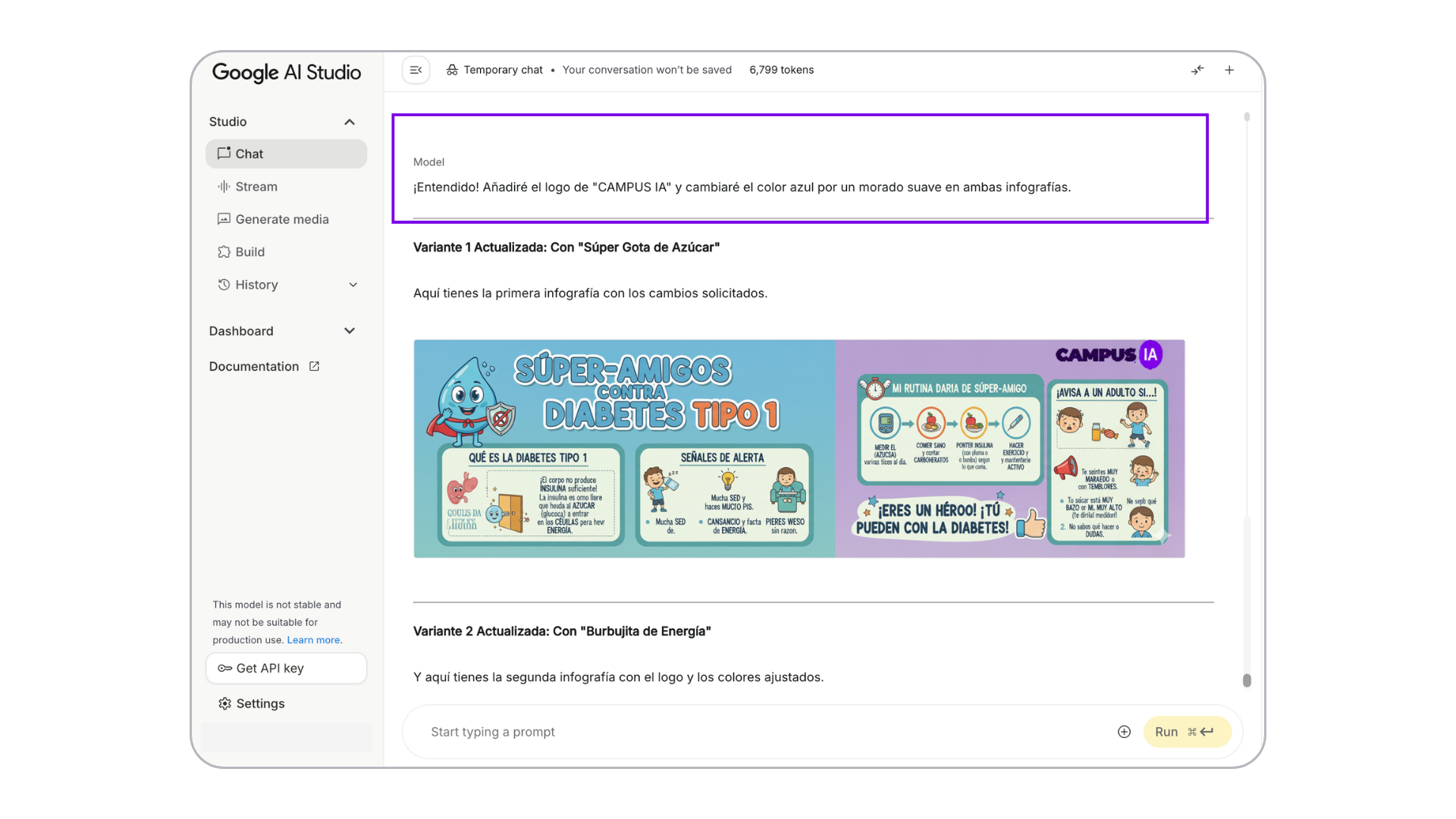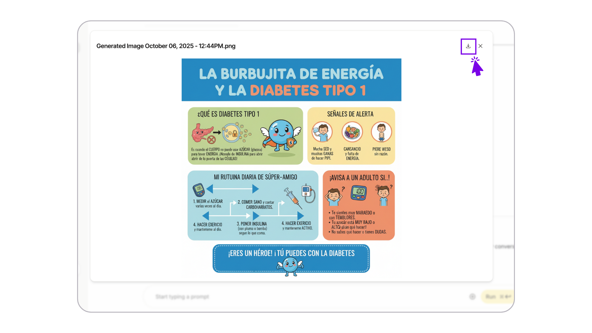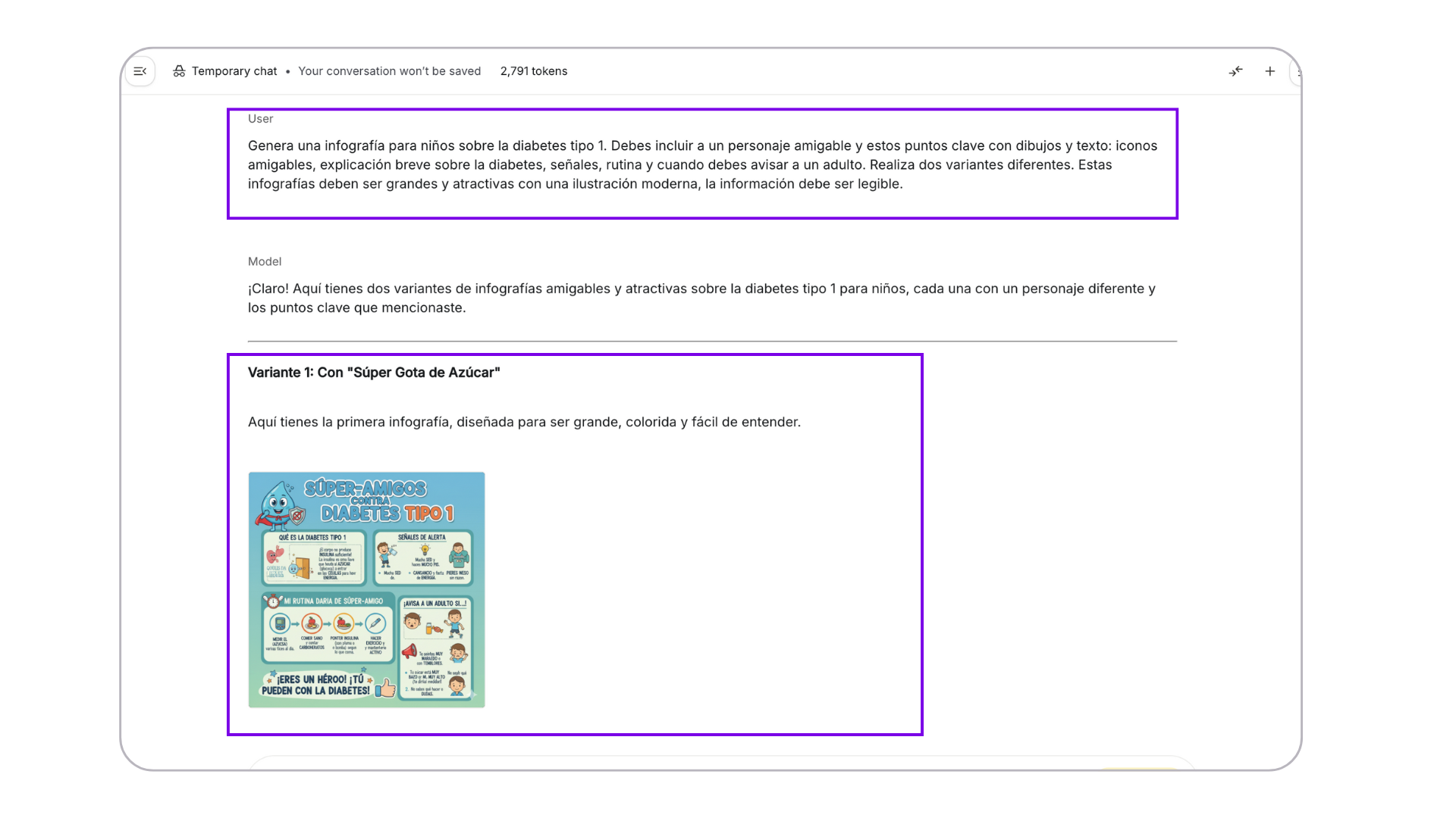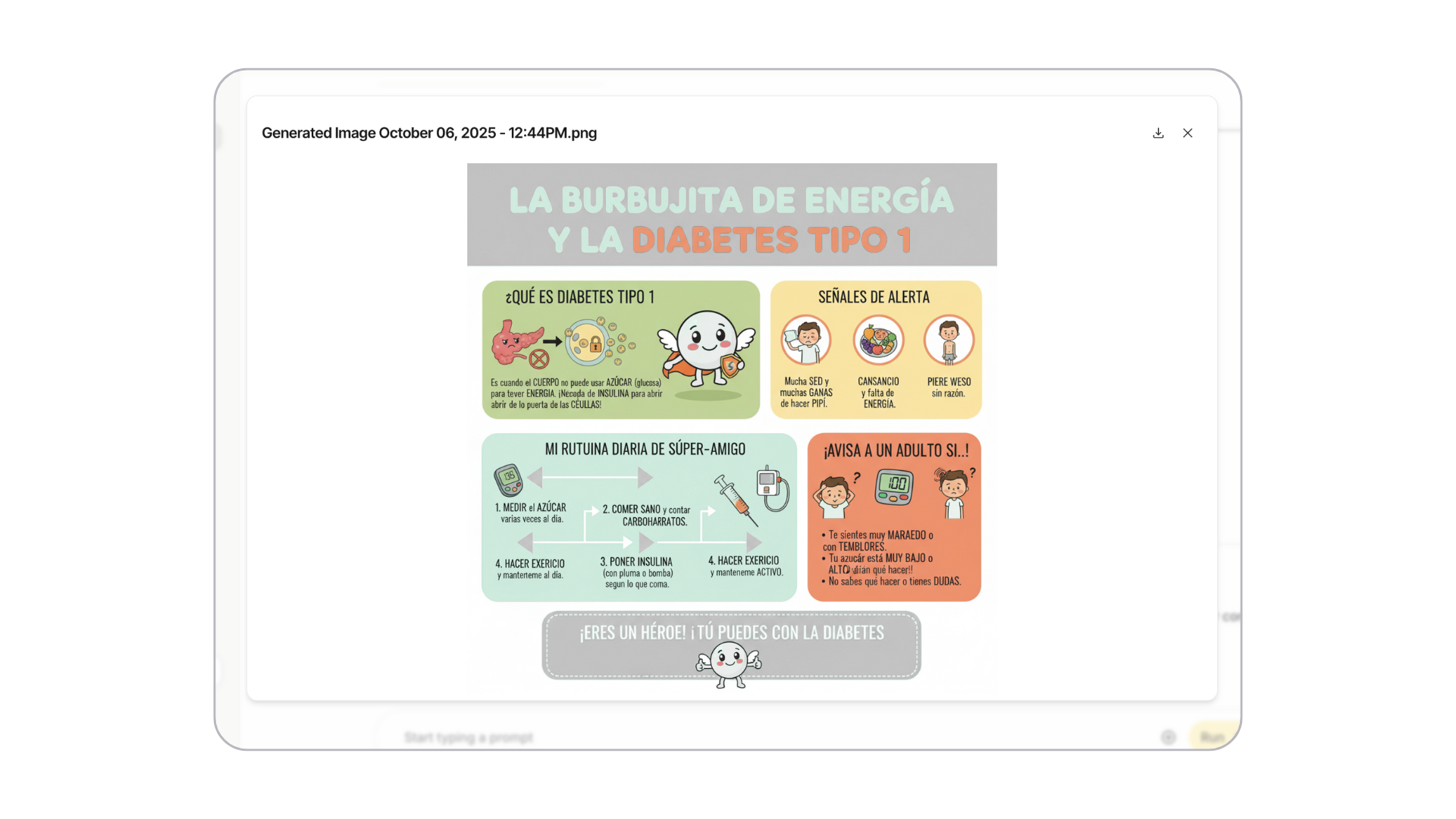 9. Las posibilidades de generación de material visual son prácticamente ilimitadas para esta herramienta de Google: Nano Banana. Ahora, utilizaremos información sobre la diabetes tipo 1 para realizar una infografía ilustrativa para pacientes menores de edad.
