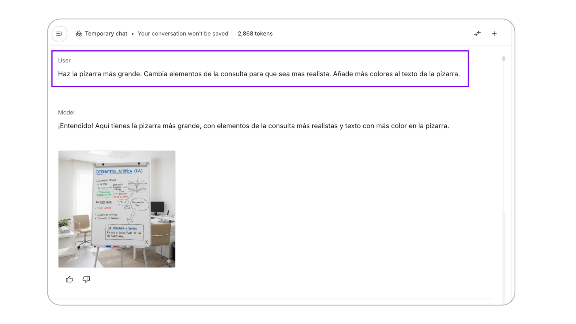 “Actúa como un profesional en crear imágenes médicas para pacientes. Necesito que generes una imagen de una pizarra en un entorno de consulta con la información que voy a darte a continuación como texto escrito en la pizarra. Contenido [copia y pega tu resumen de contenido médico o clínico]”.