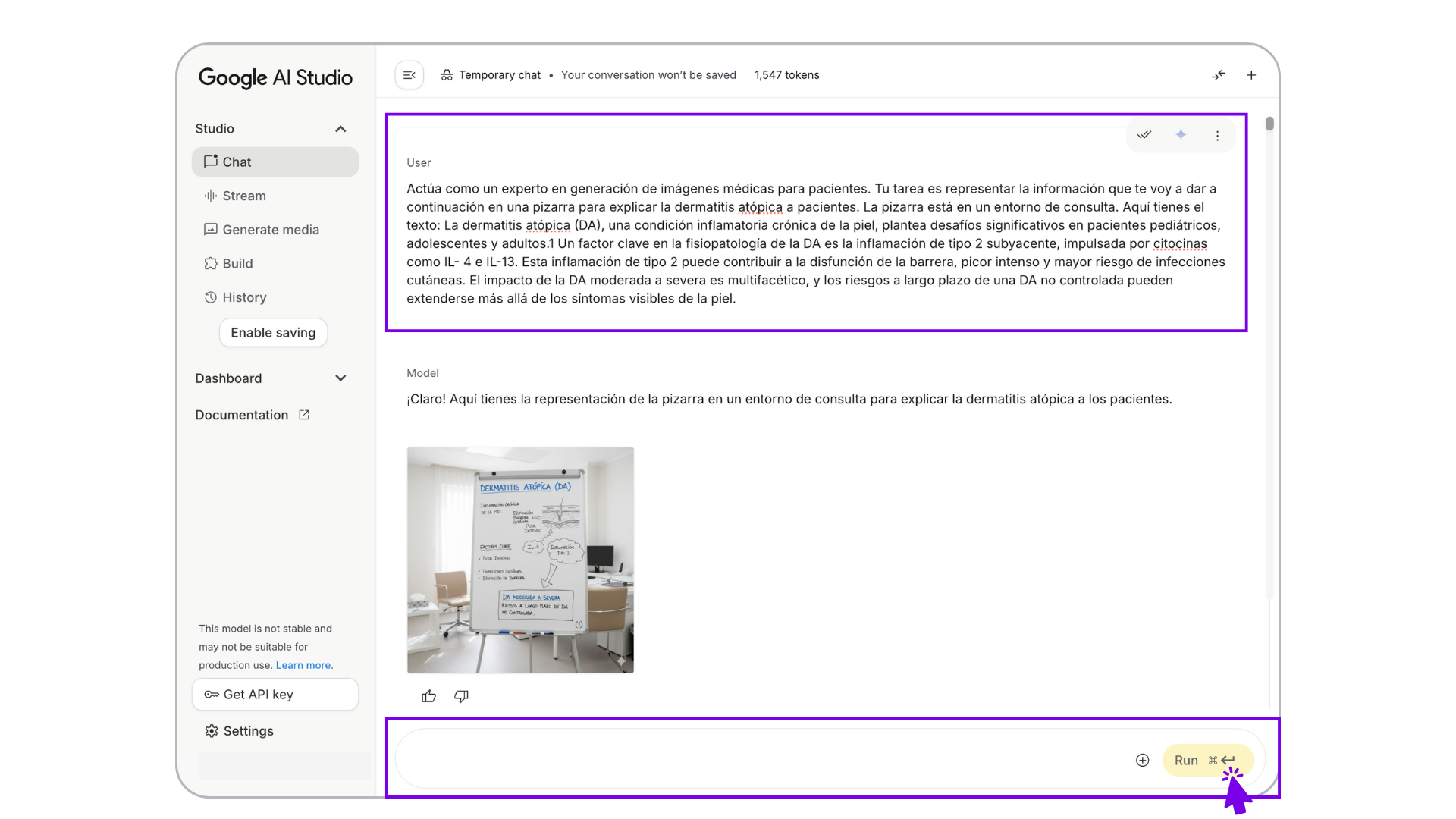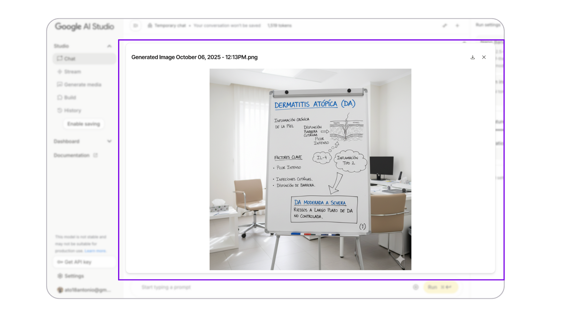 4. Regresa a Google IA Studio y accede a la herramienta Nano Banana o Gemini 2.5 Flash para generar imágenes. Puedes copiar y pegar el prompt que hemos generado el paso anterior o introducir uno nuevo si ya tenías resumido el contenido clínico que quieres transformar en imagen.