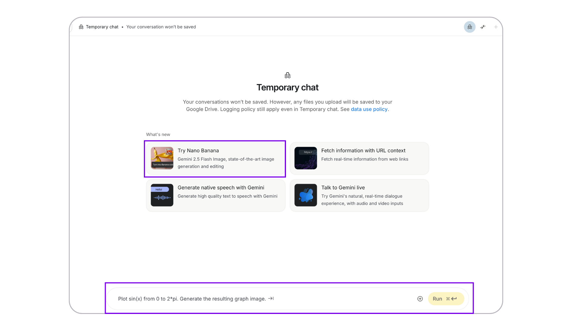 2. Nada más acceder, encontrarás la bandeja de entrada para chatear con la IA. También verás, debajo de esta bandeja, algunas herramientas recomendadas. Selecciona “Nano Banana”.