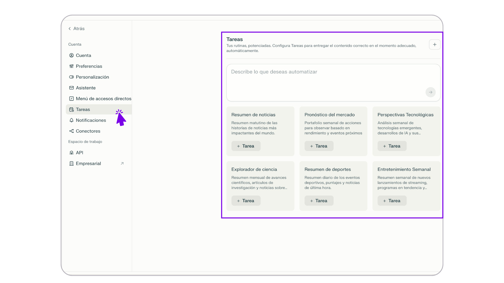 Estas tareas pueden incluir pasos secuenciales, condiciones o plantillas de texto que el asistente ejecuta automáticamente con un solo comando.