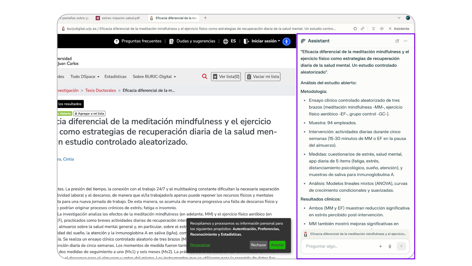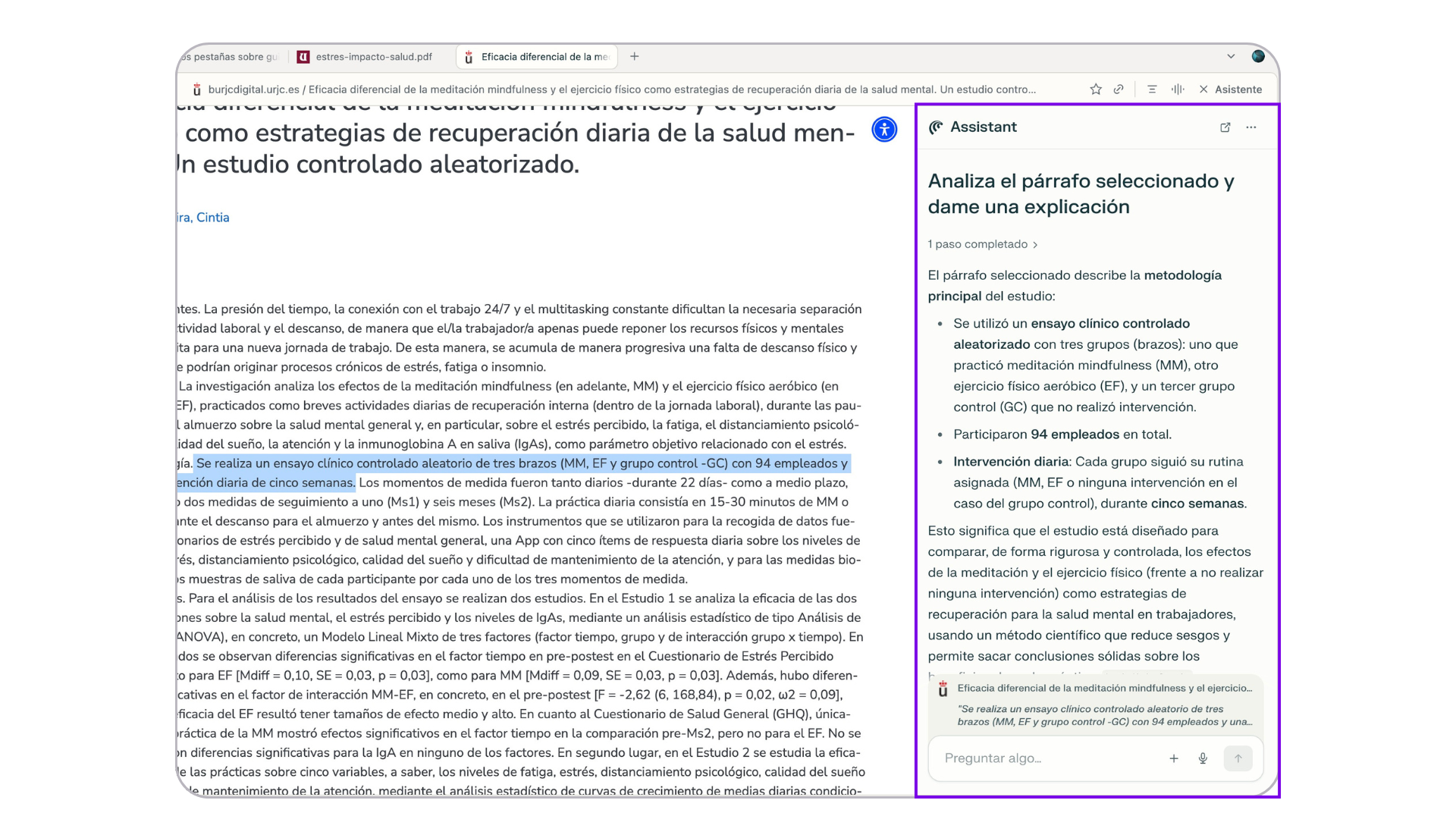 - Activa el asistente y escribe tu consulta, por ejemplo: “Compara estos estudios según metodología, población y resultados.”