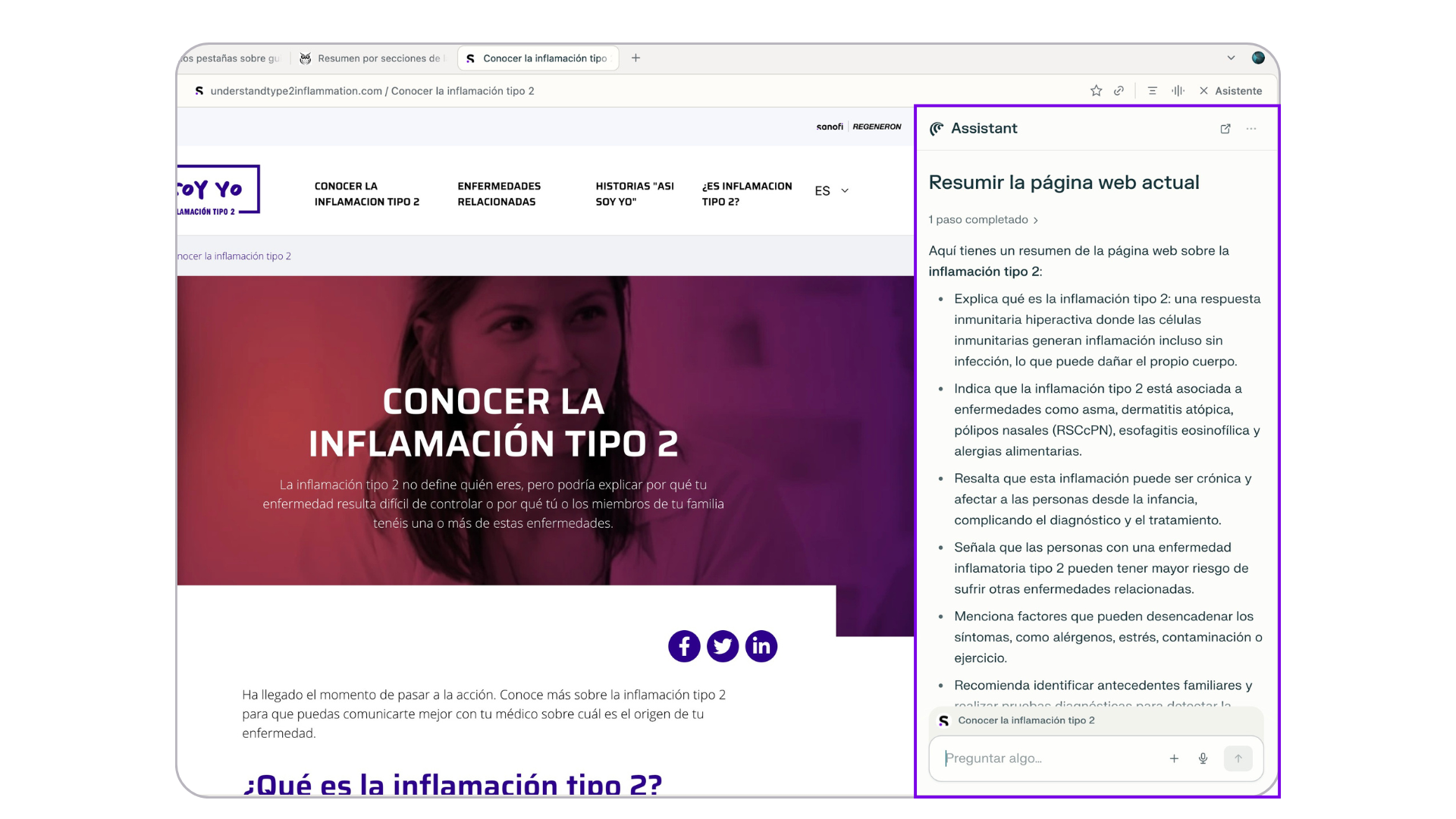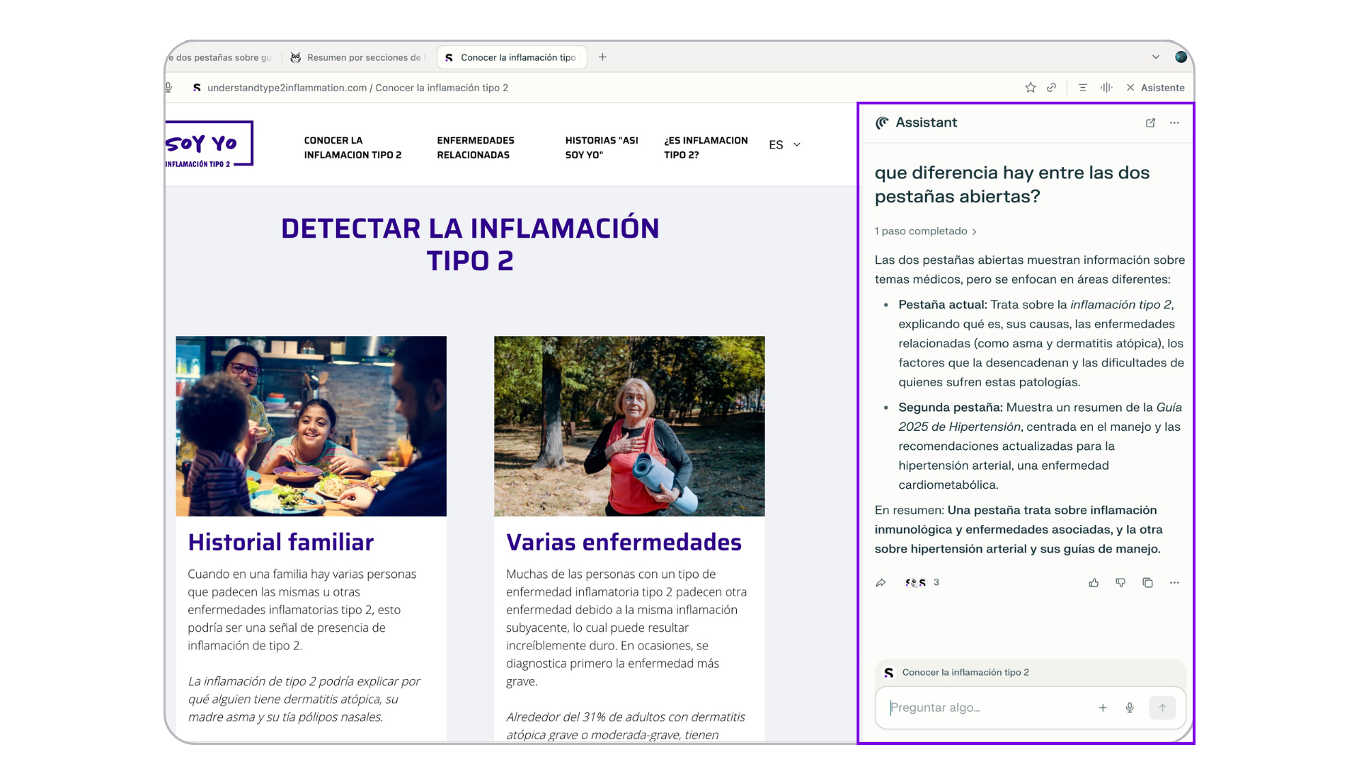 - Activa el asistente y realiza tu pregunta en el chat. Puedes usar este ejemplo: “¿Qué diferencias hay entre estas dos pestañas abiertas?”