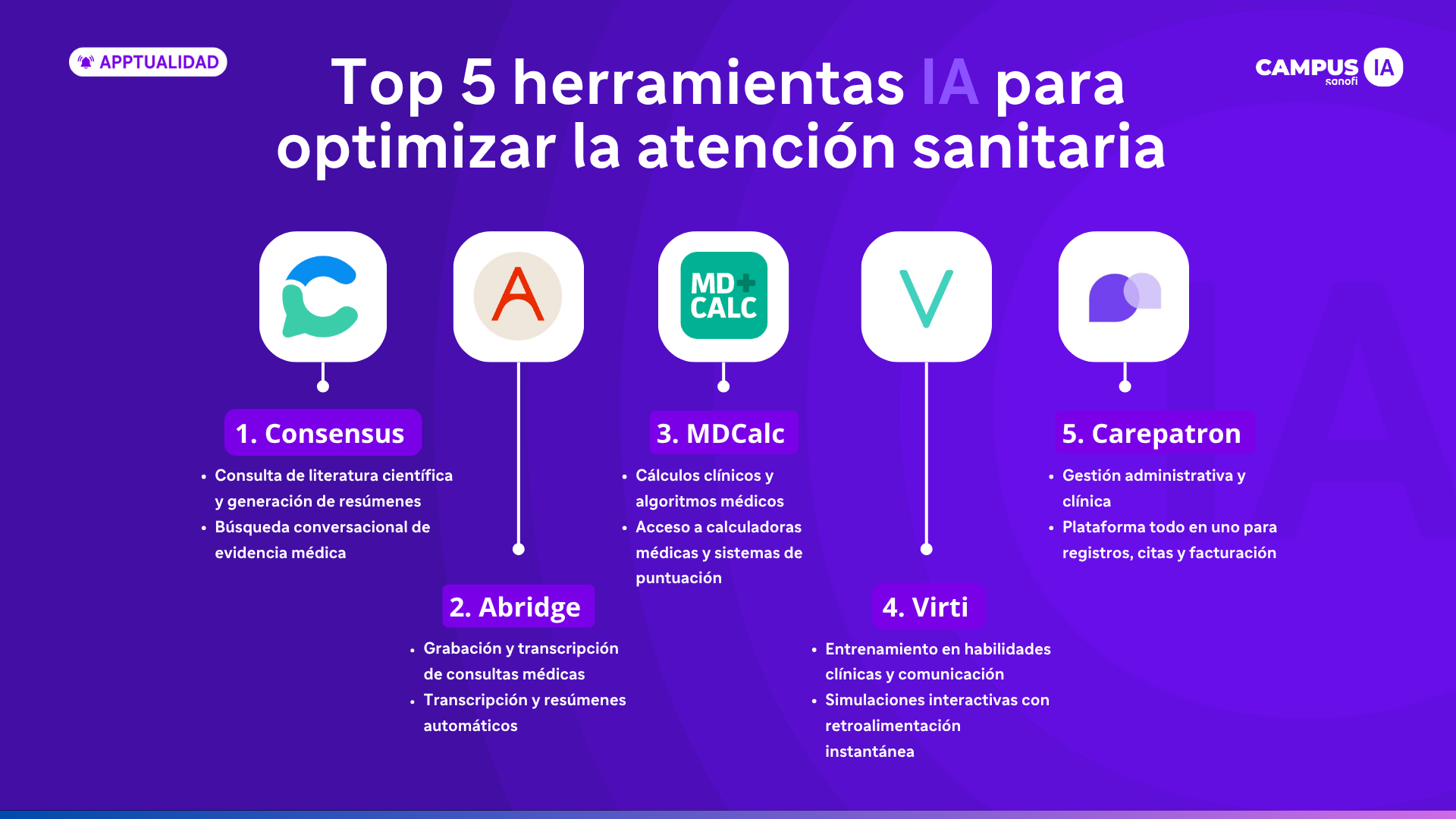 Con la integración de estas 5 herramientas IA en el día a día, los profesionales sanitarios no solo ganan en eficiencia, sino que también tienen acceso a recursos valiosos para tomar decisiones más rápidas y fundamentadas, contribuyendo al bienestar de los pacientes.