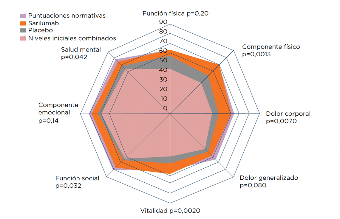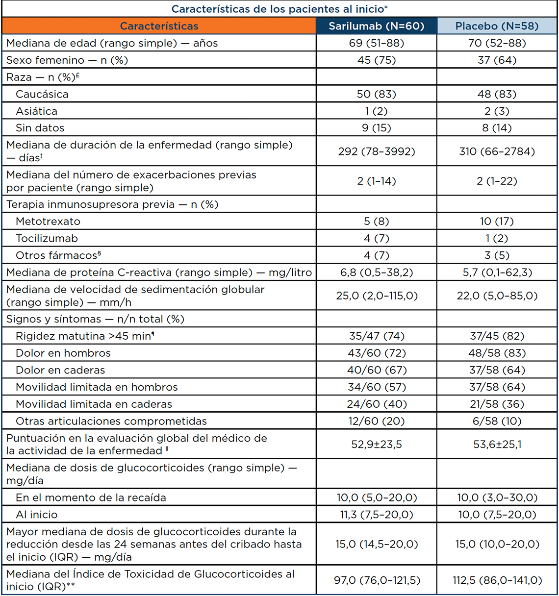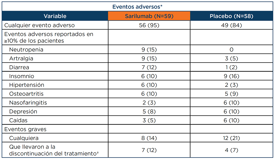 † En el grupo de sarilumab, los eventos adversos que llevaron a la discontinuación del tratamiento se reportaron en 1 paciente cada uno con enfermedad por coronavirus 2019 (Covid-19), discitis intervertebral, neumonía y nefrolitiasis, y en 3 pacientes con neutropenia. En el grupo placebo, estos eventos se reportaron en 1 paciente cada uno con Covid-19, arteritis de células gigantes, embolia pulmonar y elevación de alanina aminotransferasa. No se produjeron muertes en ninguno de los grupos del ensayo.