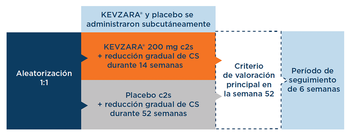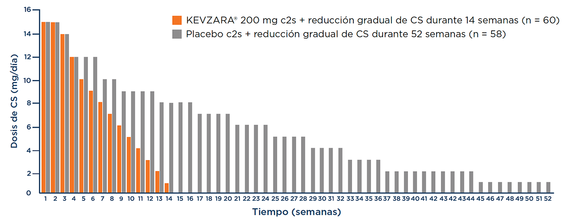 *La dosis total acumulada real de corticoides equivalente a prednisona fue inferior en el grupo de KEVZARA® (KEVZARA® 200 mg c2s + reducción gradual de CS durante 14 semanas), con una media [DE] de 1039,5 [612,2] mg y una mediana de la dosis de 777 mg respecto al grupo de placebo (placebo c2s + reducción gradual de CS durante 52 semanas), con una media [DE] de 2235,8 [839,4] mg y una mediana de la dosis de 2.044 mg.2